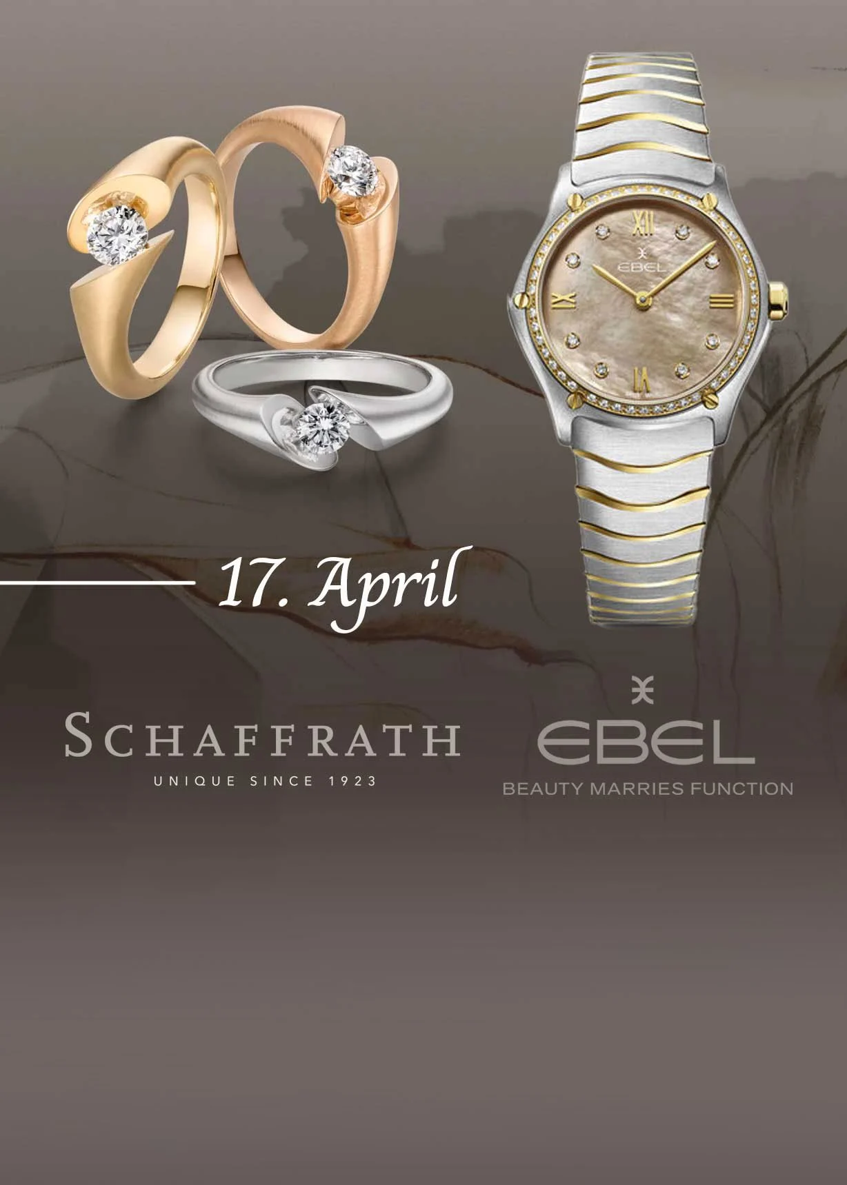 Am Freitag, 17. April, haben wir zwei Manufakturen der Extraklasse zu Gast. Erleben Sie von 10 bis 18 Uhr die exklusiven Schmuckstücke und Uhren der Marken Schaffrath und Ebel.
