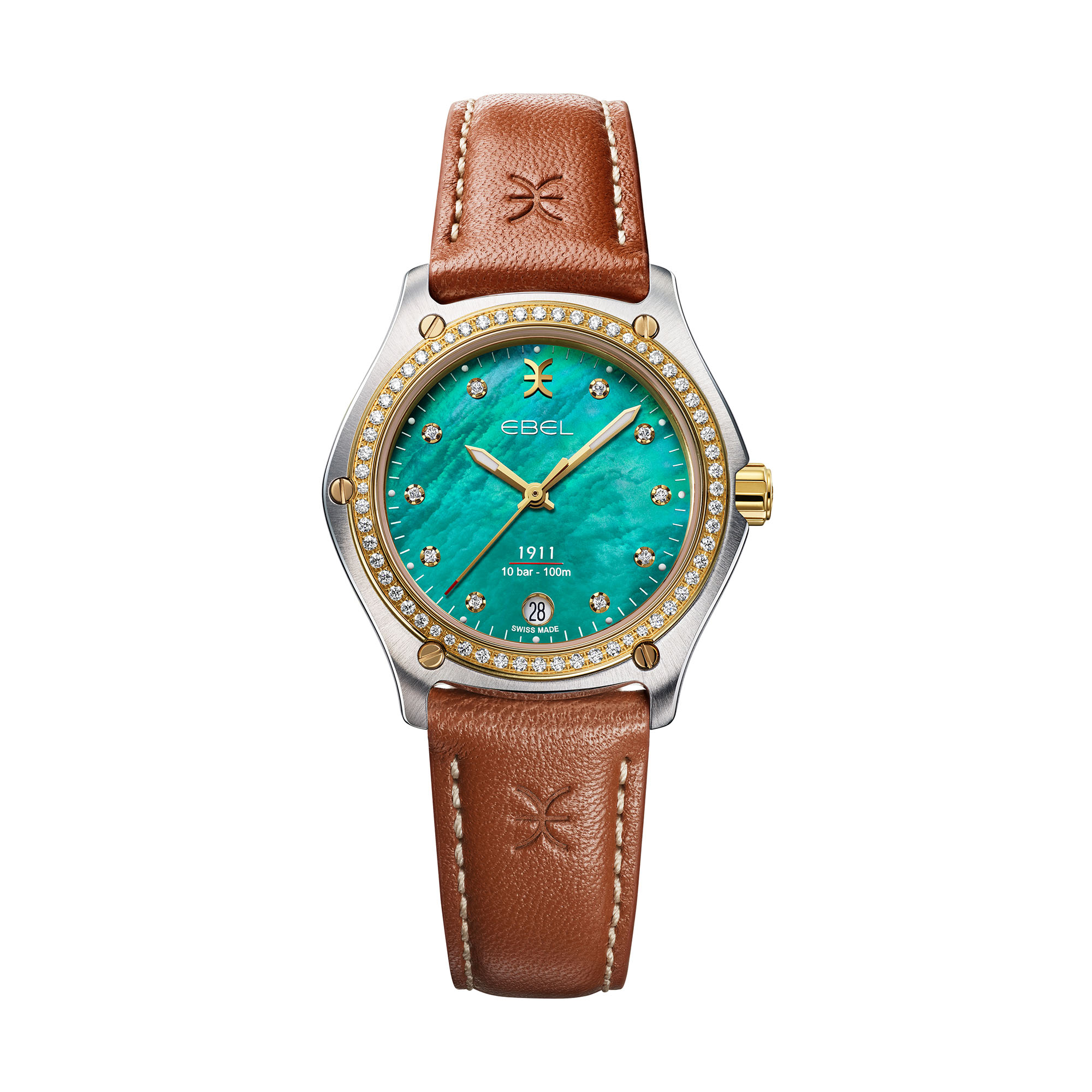 Ob am polierten zweifarbigen Edelstahl- oder am eleganten braunen Kalbslederarmband, die Ebel 1911 Deep Turquoise Uhr macht an jedem Handgelenk eine herausragende Figur. Die eleganten Konturen und polierten Goldakzente unterstreichen die ikonischen Merkmale der Ebel 1911 Kollektion, während das zuverlässige Ronda-Quarzwerk 705 und die Wasserdichtigkeit bis zu 100 Metern garantieren, dass dieses Meisterwerk der Zeitmessung so funktionell wie faszinierend ist.