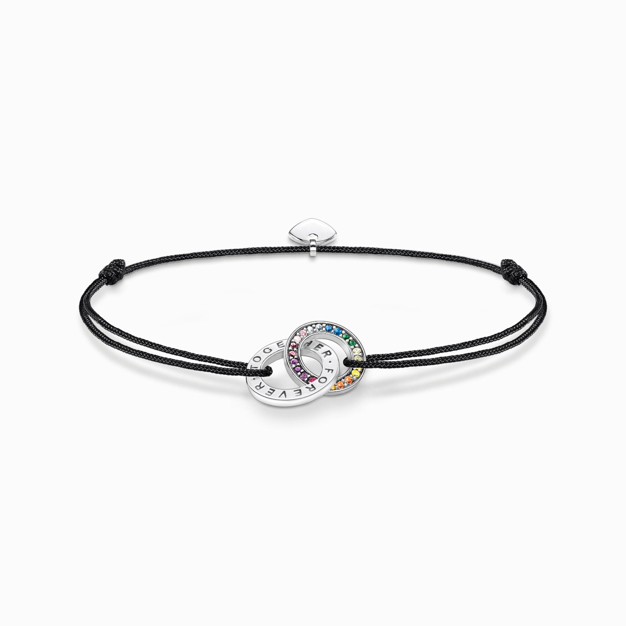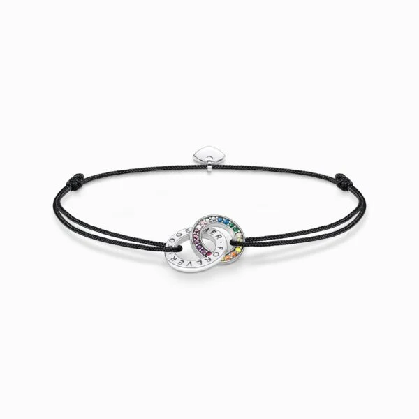 Together in Diversity: Das Armband aus schwarzem Textil ist mit zwei ineinander verschlungenen, untrennbaren Ringen geschmückt. Diese bestehen aus hochwertigem 925er Sterlingsilber, das leicht geschwärzt ist. Ein Ring ist mit „Together Forever“-Gravur versehen. Der zweite erstrahlt durch handgesetzte Steine in den Regenbogenfarben Grün, Blau, Violett, Pink, Gold, Orange und Rot. Die Ringe sind Zeichen für das Band, das alle Menschen miteinander verbindet – ganz gleich, wie verschieden sie sind.