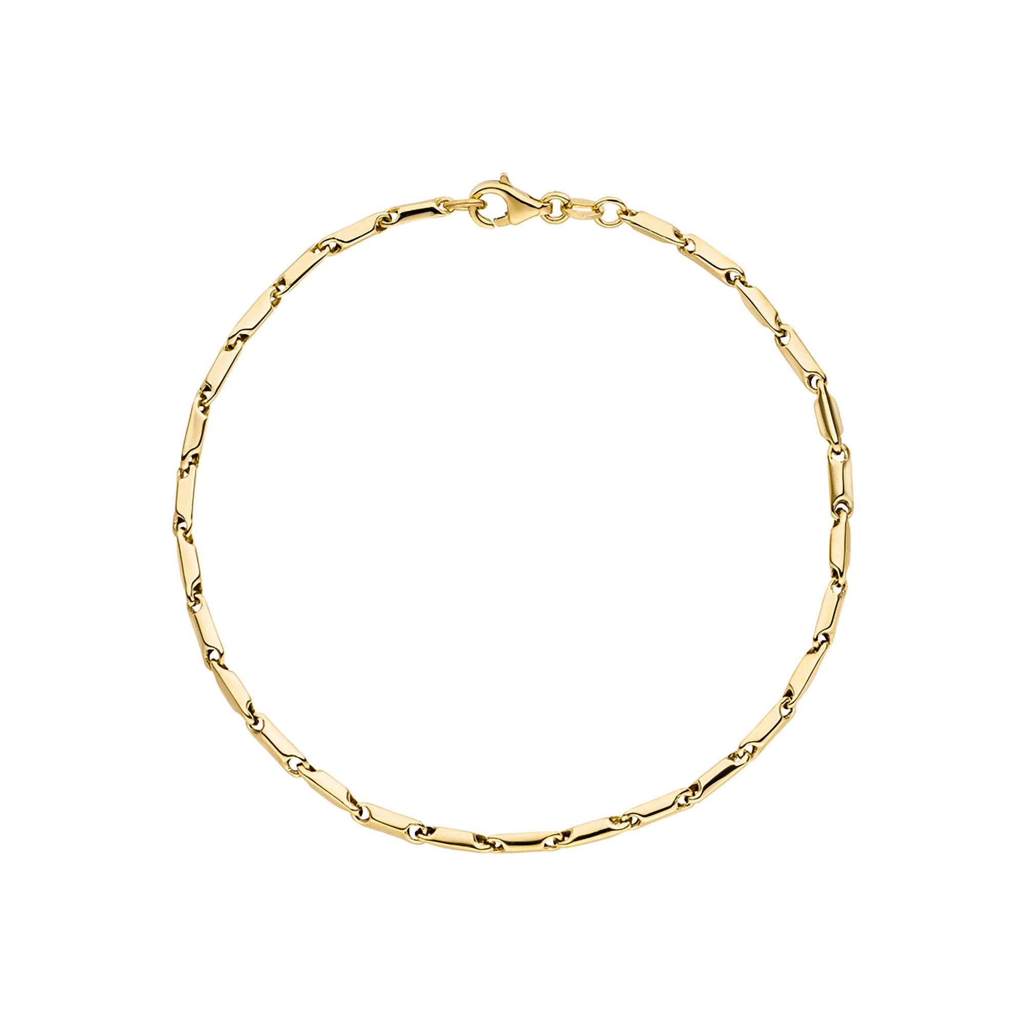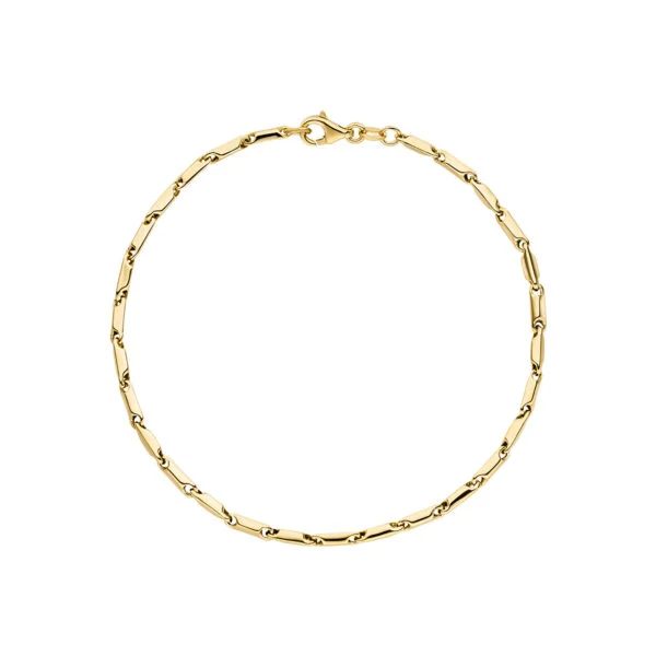 Dieses 19 cm lange Armband aus hochwertigem Gelbgold besticht durch sein lebendiges, gedrehtes Design. Die abwechselnd verdrehten Glieder verleihen dem Armband eine moderne, fast spielerische Note, die sich perfekt um das Handgelenk schmiegt. Der glatte, polierte Goldton reflektiert das Licht und unterstreicht die handwerkliche Präzision jedes einzelnen Elements.