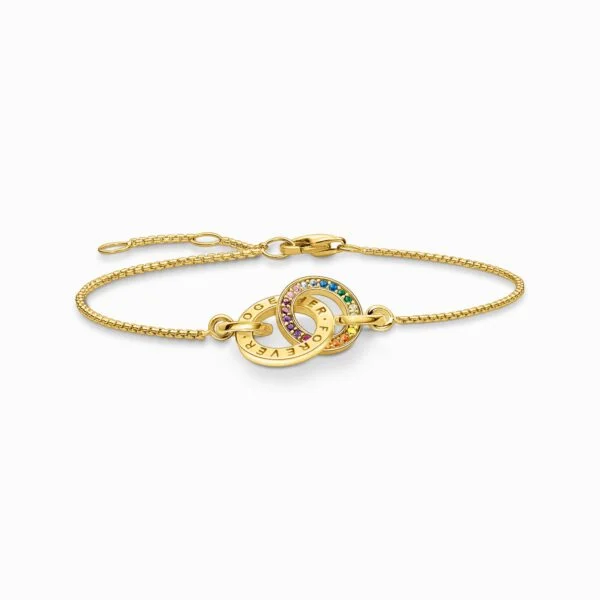 Together in Diversity: Das zarte Armband ist hochwertig aus 925er Sterlingsilber gefertigt und mit 750er Gelbgold vergoldet. Alle Blicke ziehen die beiden ineinander verschlungenen Ringe auf sich, die untrennbar den Mittelpunkt des Schmuckstücks bilden. Ein Ring ist mit umlaufender „Together Forever“-Gravur versehen, der zweite ist mit handgesetzten Steinen besetzt. Diese erstrahlen in den Regenbogenfarben Grün, Blau, Violett, Pink, Gold, Orange und Rot. Die Ringe sind Zeichen für das Band, das alle Menschen miteinander verbindet – ganz gleich, wie verschieden sie sind. Die Länge des vergoldeten Armbands lässt sich von 16 bis 19 cm verstellen und individuell ans Handgelenk anpassen.