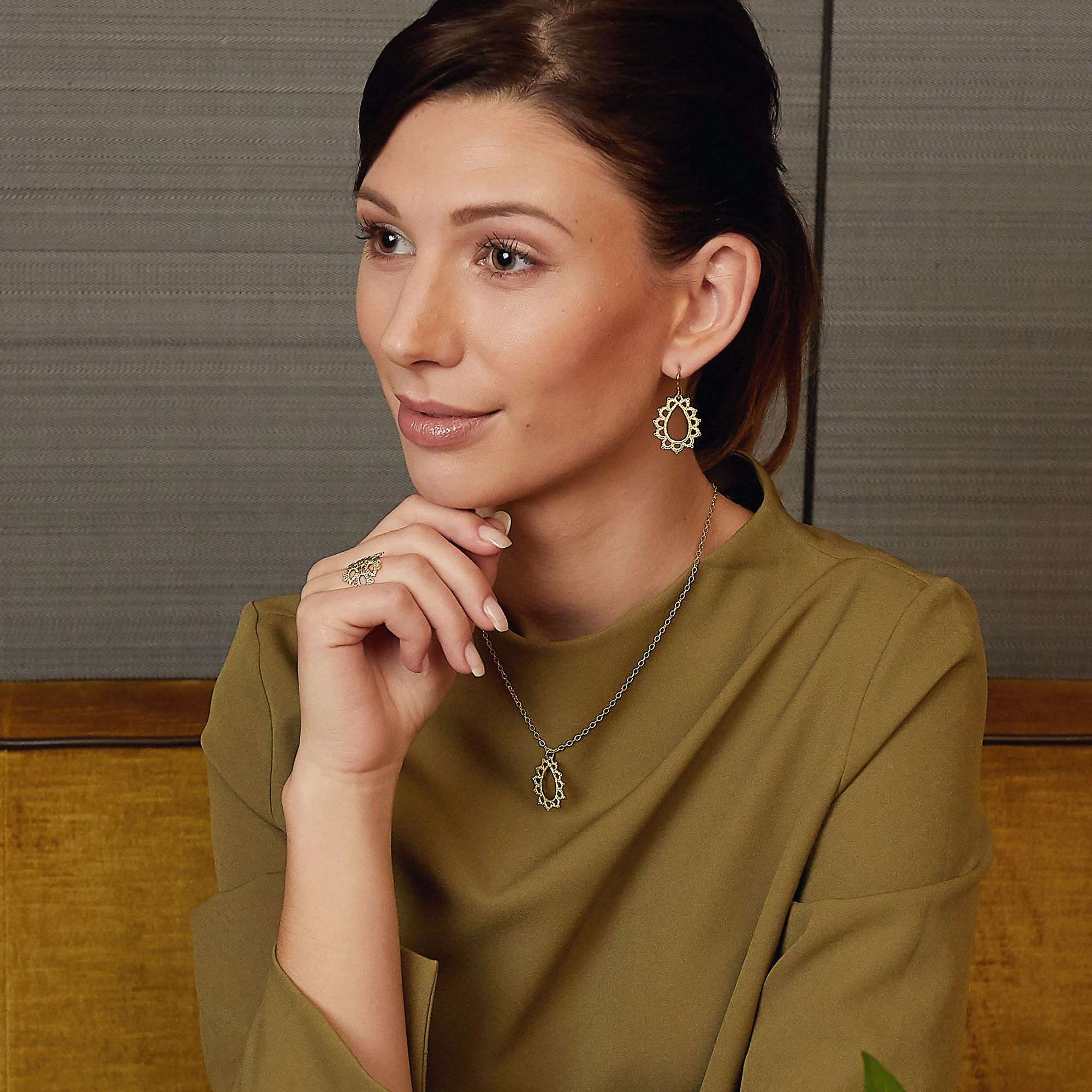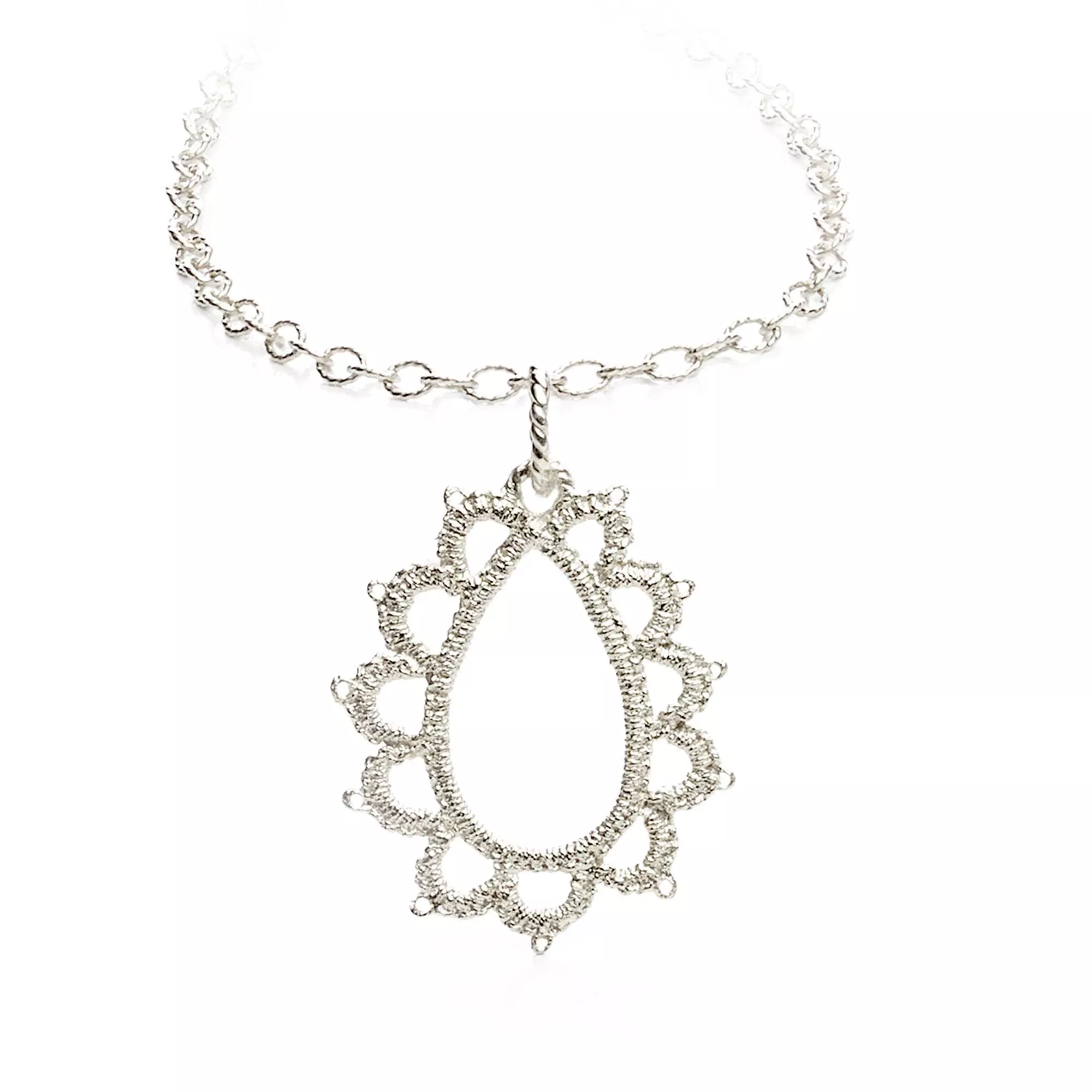 Der Anhänger Anna besticht durch seinen filigranen Cut-Out-Look. Namensgeberin Anne Boleyn ist die bekannteste der sechs Frauen König Heinrichs VIII. von England und wurde als seine Favoritin später auch Königin. Ihre faszinierende Persönlichkeit diente als historische Vorlage für die Oper Anna Bolena und für die Schmuckkreationen Anna von Brigitte Adolph. Auf einem Gemälde entdeckte die Designerin den Ziersaum, der Annes Robe schmückt: Feine Bögen mit einer kleinen Schlinge. In Tropfenform zu Ohrhängern, Anhänger und Ring geformt, lassen sie ihre Trägerin geradezu königlich strahlen. Der Anhänger wirkt am besten an einem aus fein kordiertem Draht gefertigten Collierkettchen von Brigitte Adolph wie die 42 cm oder 45 cm lange XS-Chain.. Die Gesamtlänge des Anhängers beträgt 2 cm.Der Anhänger hat einen Durchmesser von 14 mm.