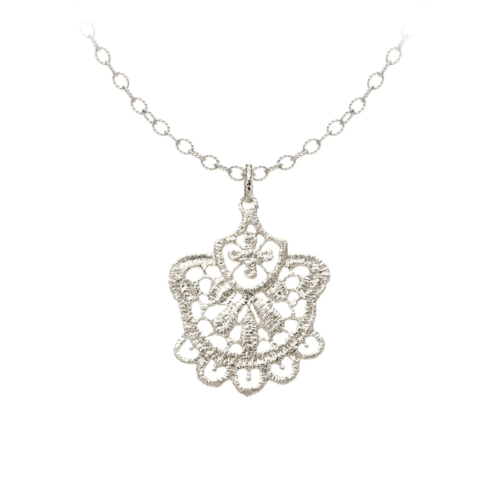 Billie-Jean ist filigranes Spitzendesign mit einem verwegenen Look, ein Traum von Abenteuer und wilder Freiheit. Der Anhänger wirkt am besten an einem aus fein kordiertem Draht gefertigten Collierkettchen von Brigitte Adolph wie die 42 cm oder 45 cm lange XS-Chain.