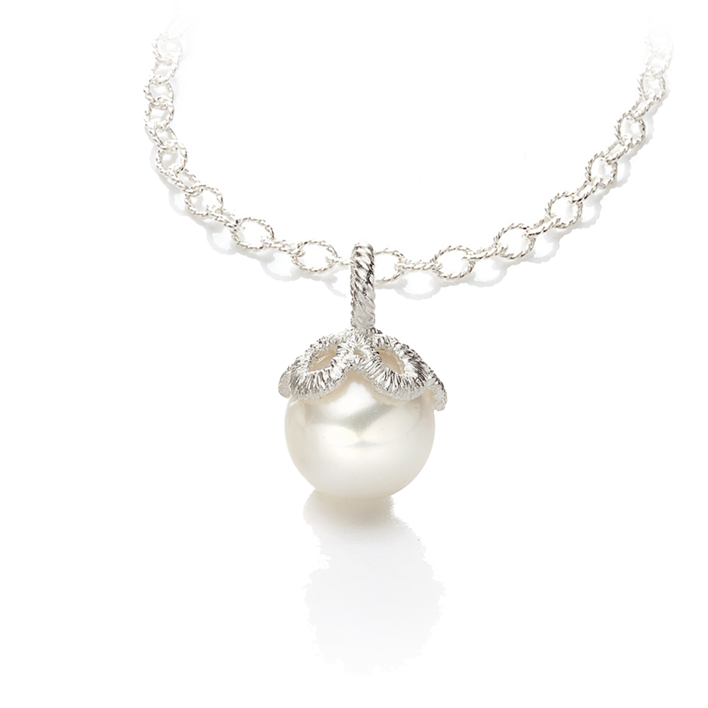 In der gleichnamigen Oper liebt Prinz Sternenschnuppe Frau Luna und jeder weiß warum: Ihr Perlenglanz und ihre sanfte Anmut sucht ihresgleichen. Die Schmuckstücke Frau Luna erinnern an die begehrte Mondfrau durch die hell schimmernden Süßwasserperlen und die femininen Rundungen der Fassung. Der Anhänger wirkt am besten an einem aus fein kordiertem Draht gefertigten Collierkettchen von Brigitte Adolph wie die 42 cm oder 45 cm lange XS-Chain. Die Gesamtlänge des Anhängers beträgt 1,5 cm.