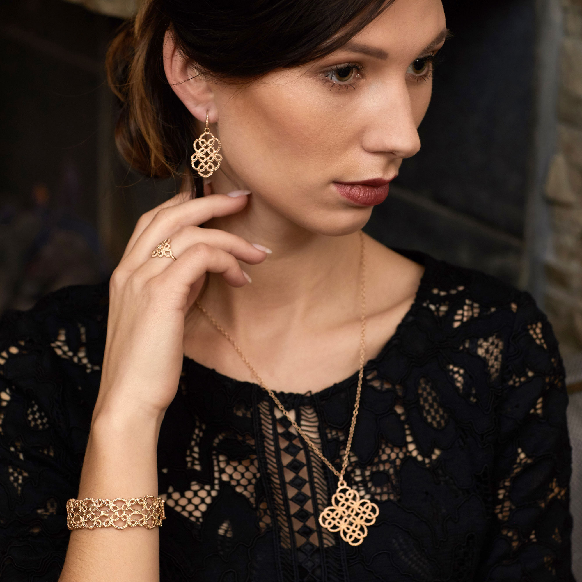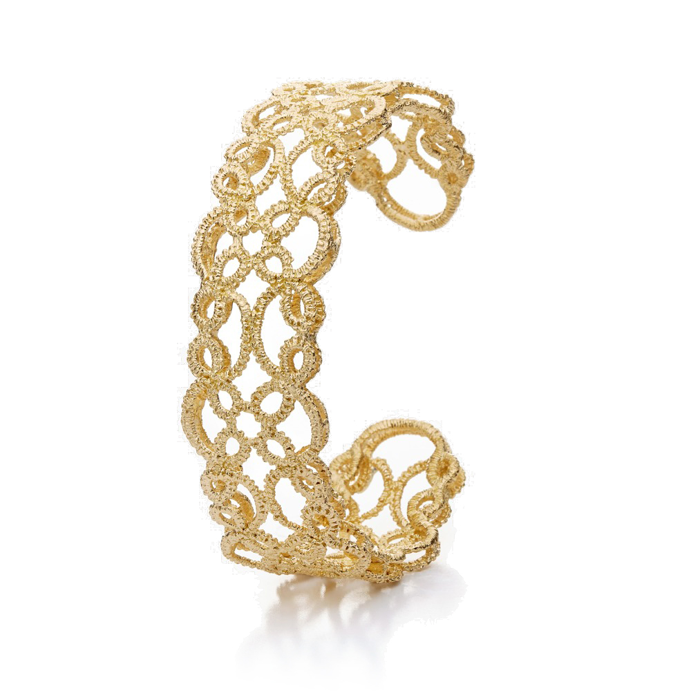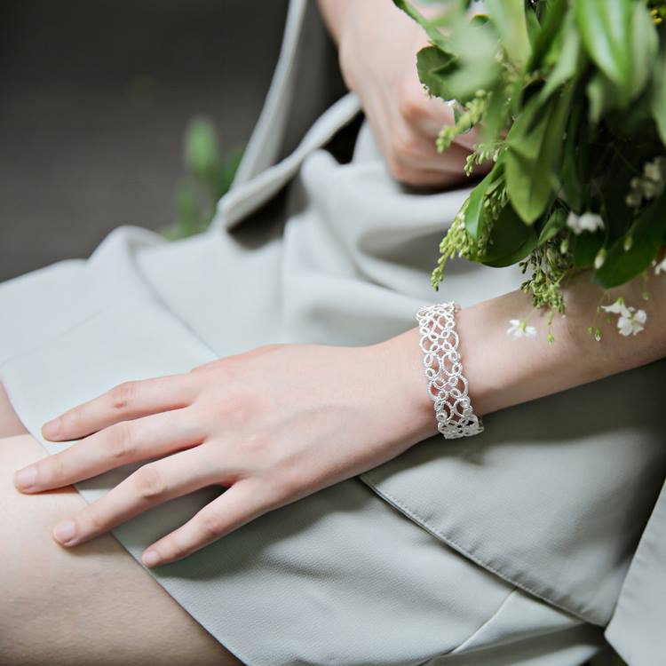 Die ornamentalen Schmuckstücke Lakmé erhalten durch die zarte Spitzenoptik eine beschwingte Leichtigkeit. Die dekorative Gitterform erinnert an das indische Unendlichkeitssymbol und spiegelt die Geschichte der Oper Lakmé wider, nach der die Kollektion benannt wurde. Die Armspange ist erhältlich in den Handgelenkumfängen S (15 cm), M (16 cm), L (17cm) und ist 1,8 cm breit.