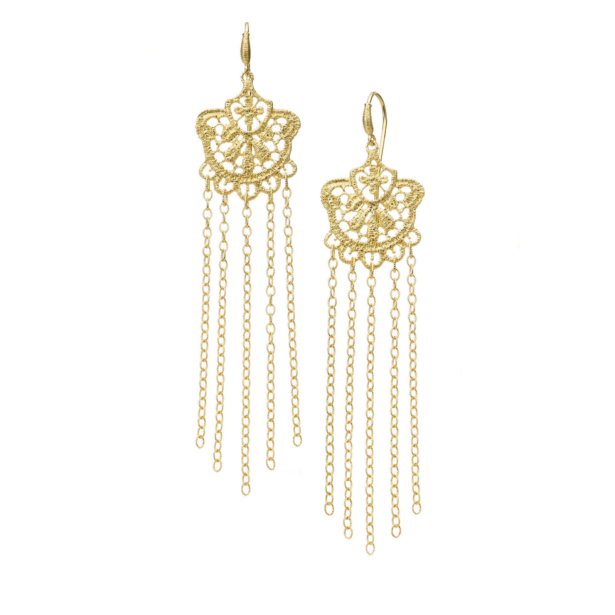 Wie ein fein sprühender Wasserfall rieseln zarte Ketten am Ohrschmuck Billie-Jean hinab. Sie verleihen dem filigranen Spitzendesign einen verwegenen Look und lassen von Abenteuer und wilder Freiheit träumen. Die Gesamtlänge des Ohrrrings beträgt 10,5 cm.