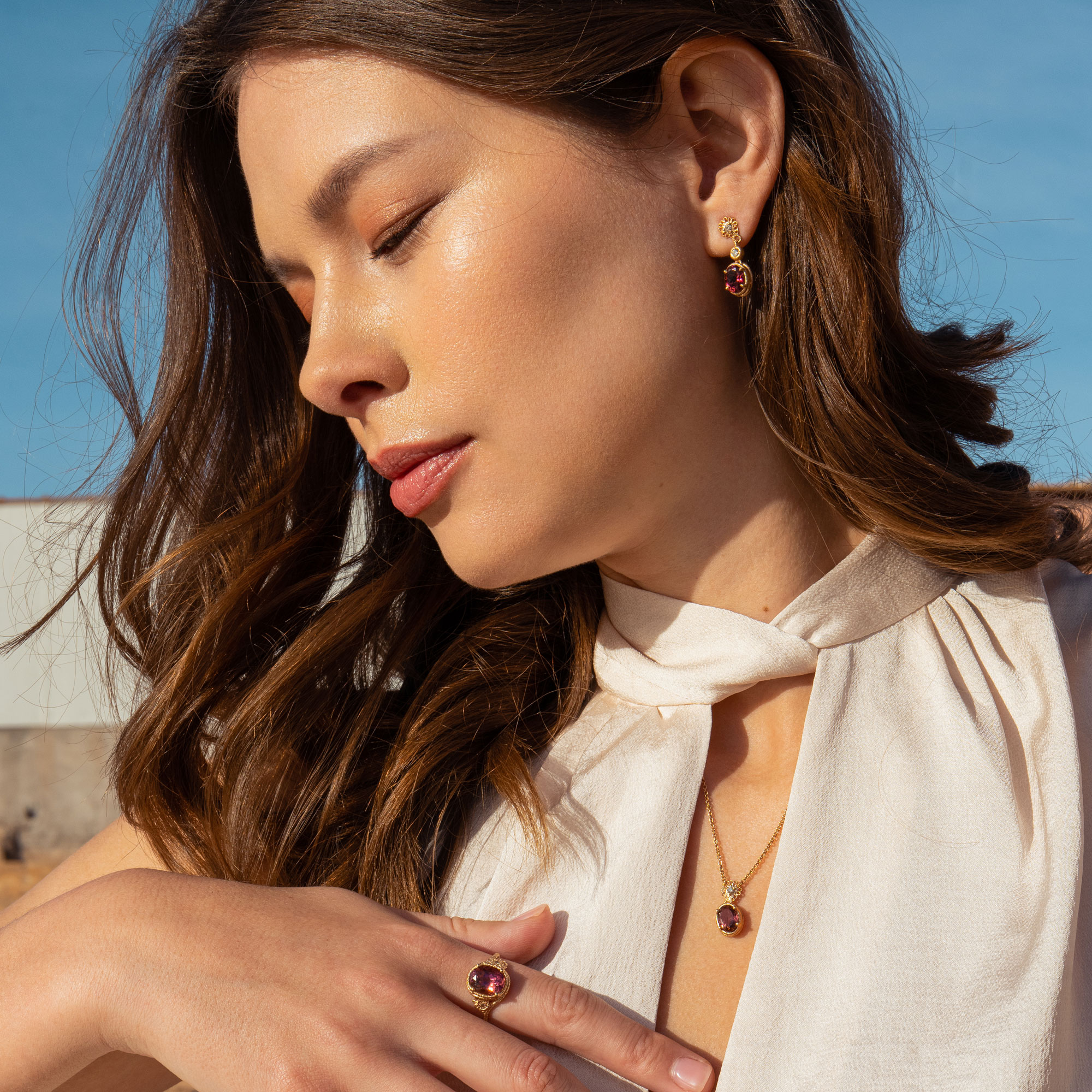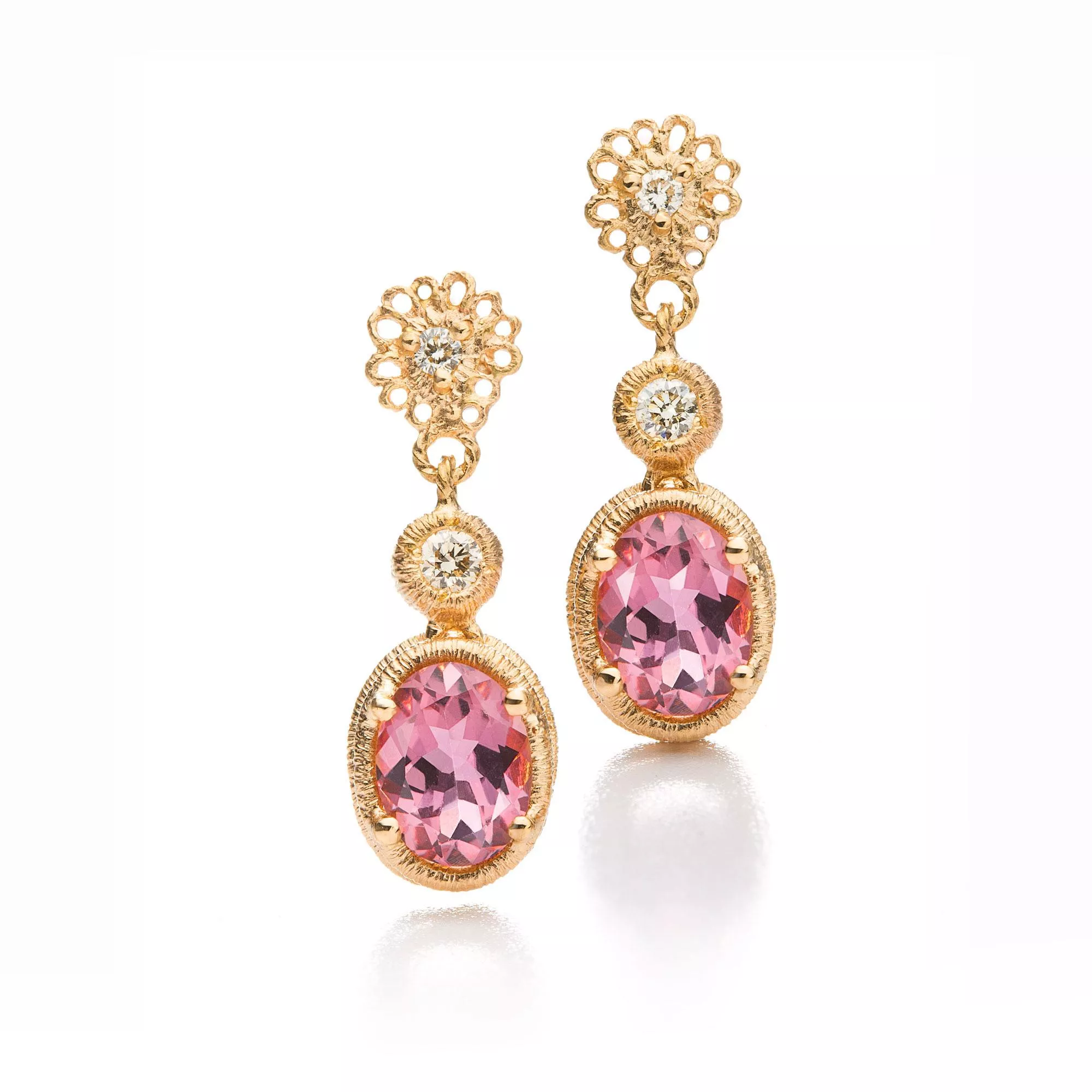 Diese Ohrringe versprühen pure Lebensfreude! Blumen, Farben und verspielte Romantik – das Design mit zartem Spitzendekor scheint aus dem Märchen entsprungen und lässt die Schmuckträgerin zur Prinzessin werden. Mit modischer Spitze getragen, wirkt der Ohrschmuck mit funkelndem Farbedelstein und Brillanten besonders feminin und edel, doch auch lässige Casuallooks erhalten mit Theresa eine elegante Note. Die Ohrstecker verbinden gekonnt Vintage mit Moderne und erfüllen Schmuckträume – nicht nur von Romantikerinnen. Die Gesamtlänge der Ohrringe beträgt 2,4 cm.
