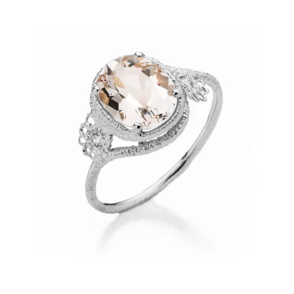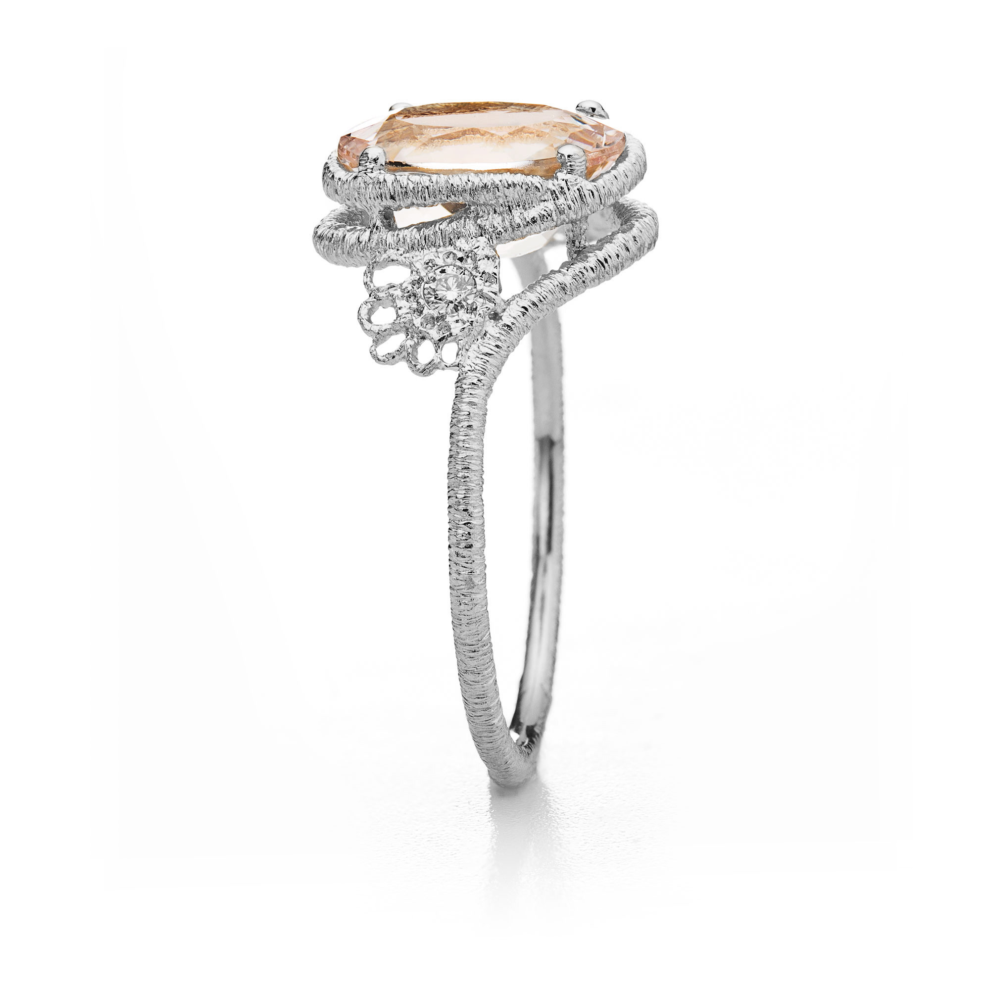 Ein Ring, der Freude schenkt, der ein Lächeln zaubert, der die großen und kleinen Momente des Lebens feiert – das ist Theresa, unser filigraner Cocktailring. Theresa versprüht gute Laune und setzt einen fröhlichen Akzent am Finger. Theresa ist Vintage und Moderne in einem, zart und stark zugleich, aufsehenerregend, ohne aufdringlich zu sein… Die seidige Struktur und die schmale Ringschiene verleihen dem Ring eine besondere Anmut. Der rosé-apricot-farbener Morganit, lässt an zart errötende Wangen denken.