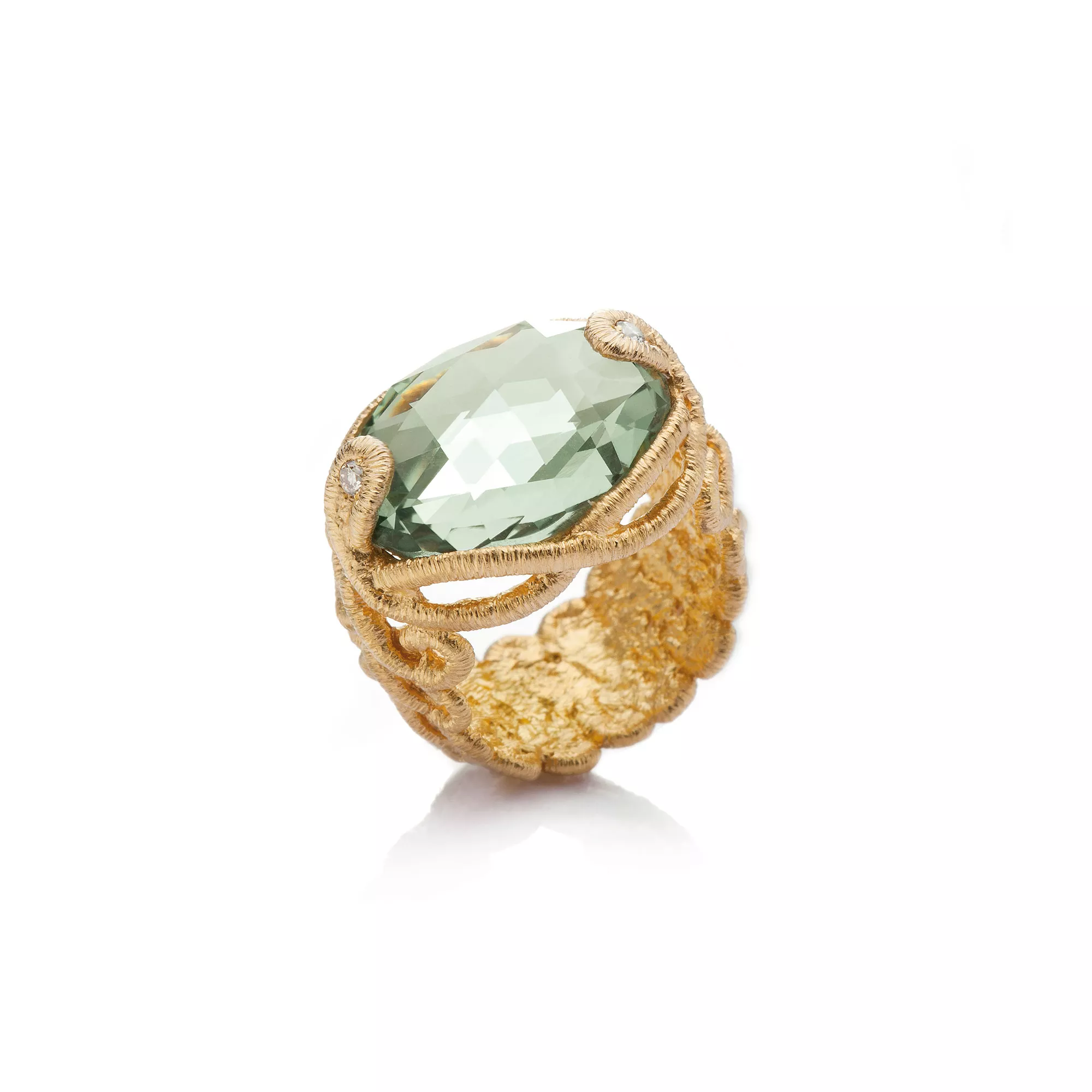 Wie filigrane Fäden erscheint die Struktur des Fingerschmeichlers Undine. Brigitte Adolph fertigt Schmuck, der wie Spitze aussieht, jedoch aus massivem Edelmetall besteht. Mit filigraner Leichtigkeit und dekorativer Transparenz erzählt sie in der Linie Undine die Geschichte einer Wassernymphe. Der facettierte, grün schimmernde Prasiolith ist der besondere Eyecatcher, flankiert von zwei champagnerfarbenen Brillanten. Der Ring hat eine Breite von 16 mm.