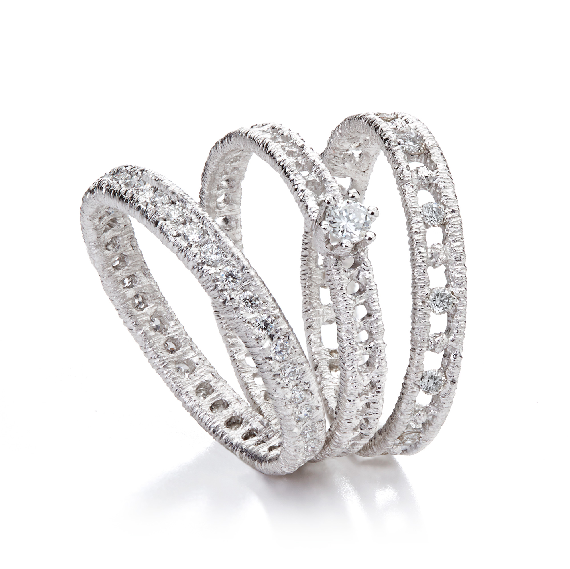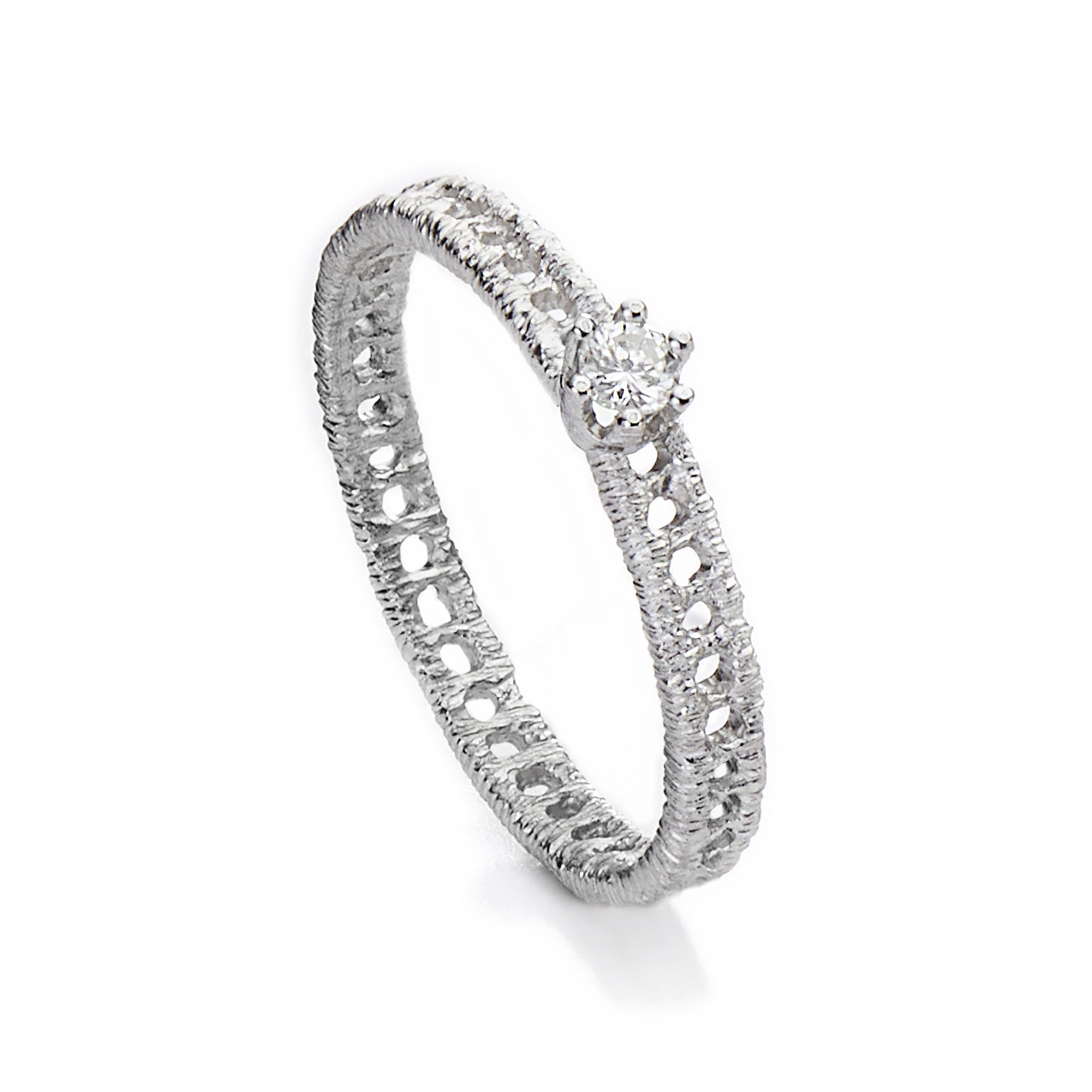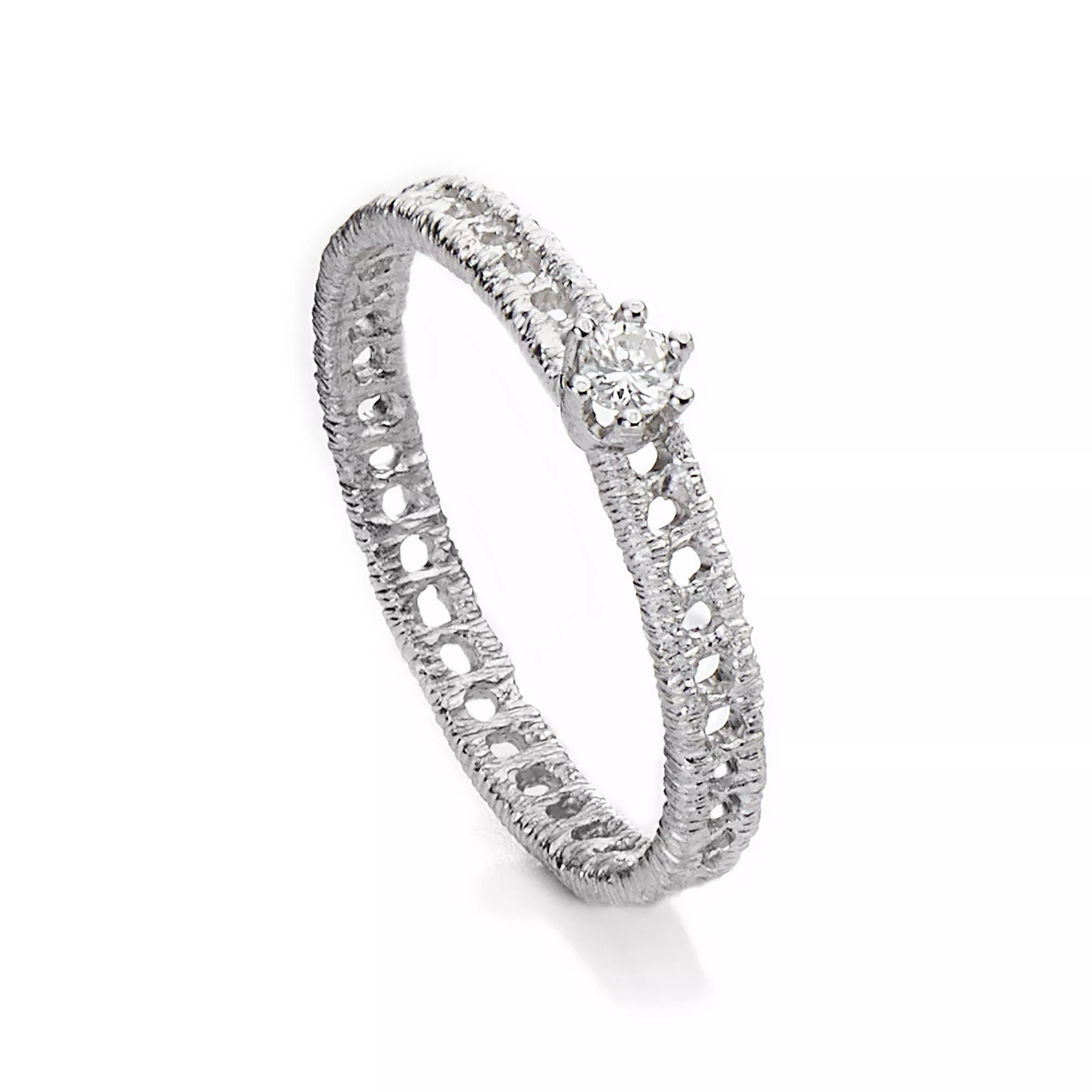Der Solitärring „Figaro“ in 750er Weißgold verbindet als Verlobungsring die Fragen aller Fragen mit einem wertvollen Zeichen von Wertschätzung. Lange als altmodisch abgetan, erlebt der Heiratsantrag heute eine Renaissance. Spitze erinnert an die Handwerkskunst vergangener Zeiten und eignet sich perfekt als gestaltendes Element in einem romantischen Antragsring. Der Diamant in Krappenfassung ist klassisch und wohl gerade deshalb im Moment der gefragteste Besatz für Verlobungsringe. Die Breite des Ringes beträgt 2,7mm.