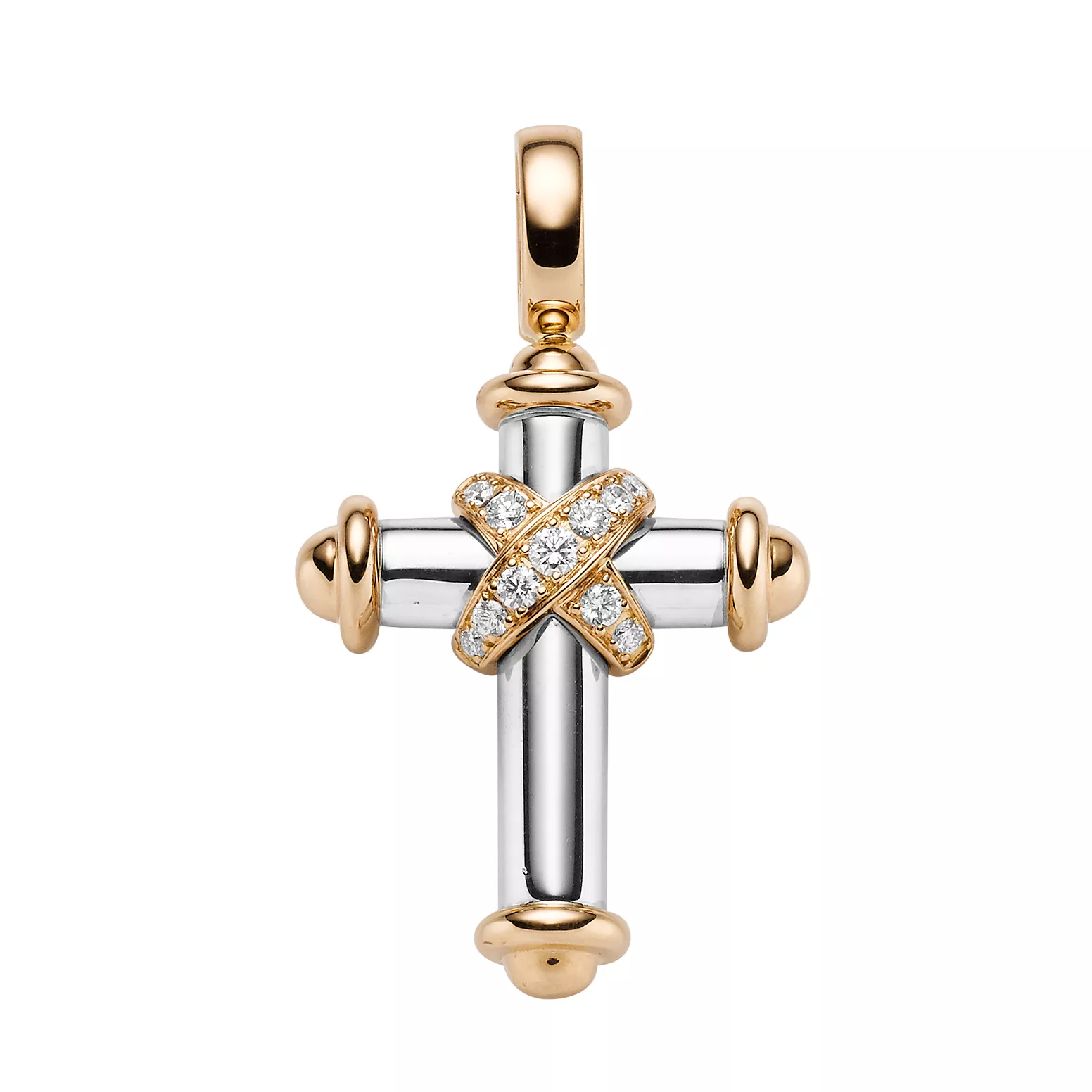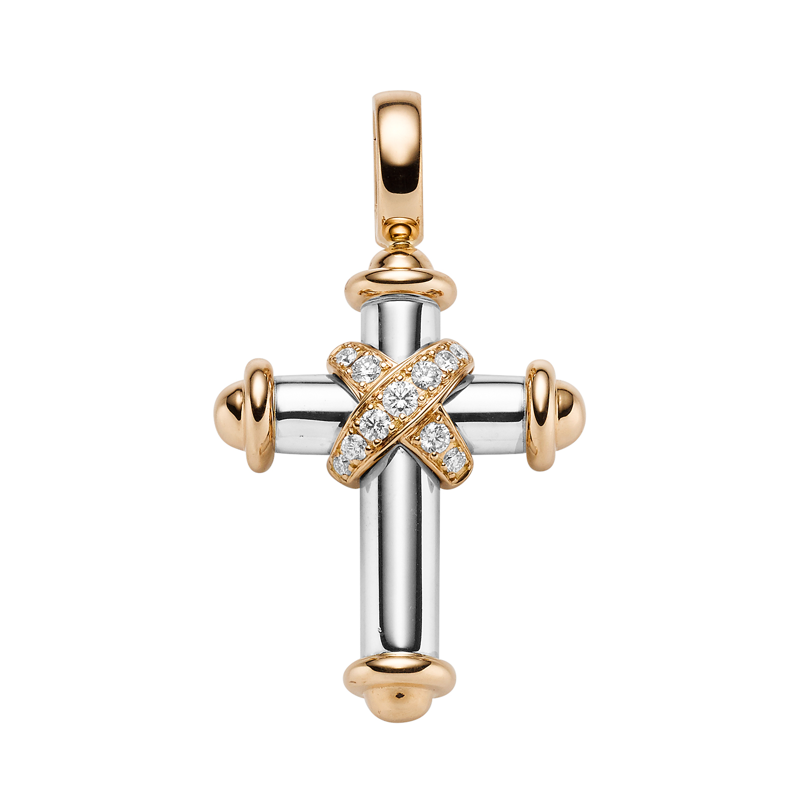 Die mittlere Größe des Kreuzes ist in Rosé- und Weißgold gearbeitet. Der Überschlag ist mit Brillanten ausgefasst