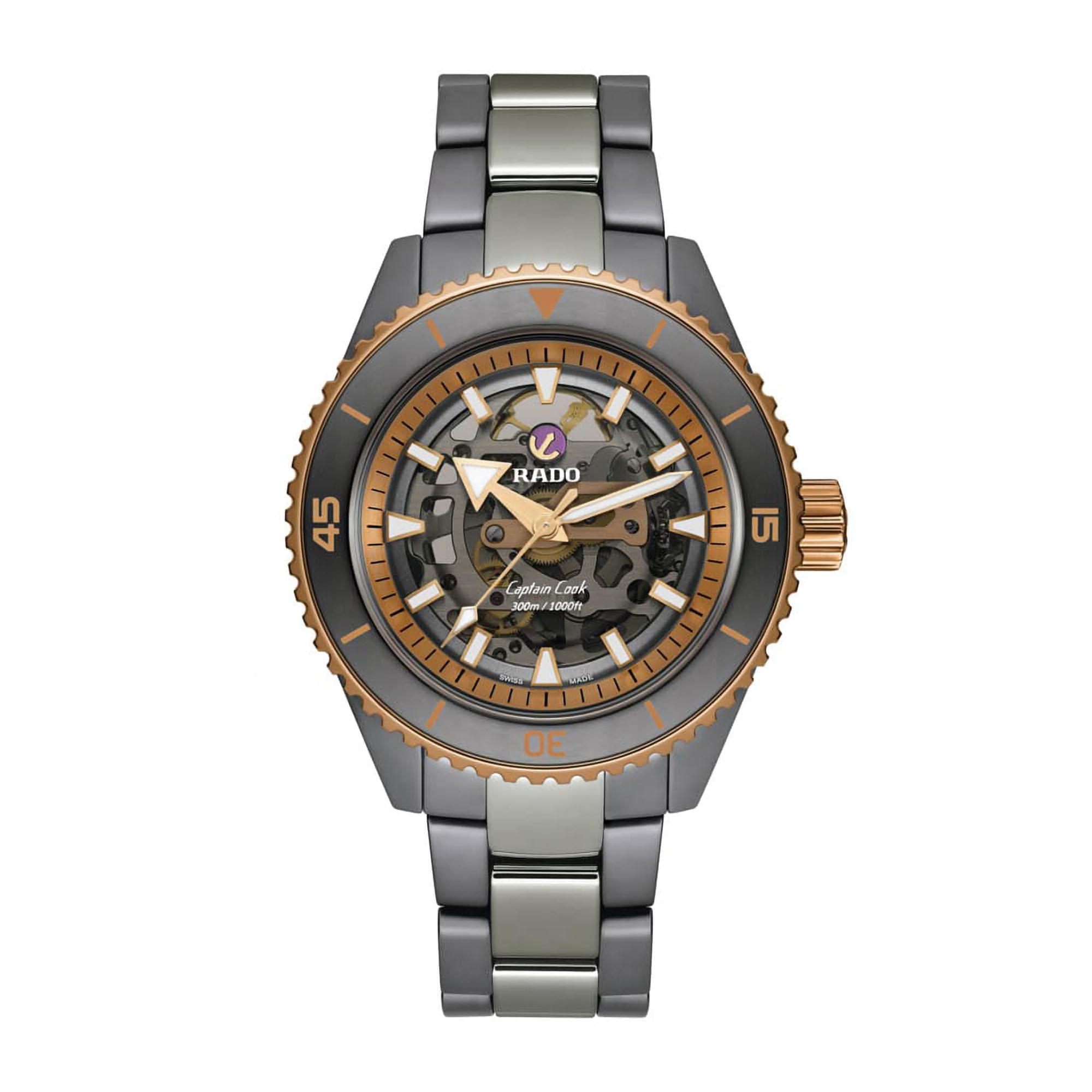 Die Captain Cook High-Tech Ceramic Skeleton stellt ihr innovatives R808 Uhrwerk zur Schau – ein Wunderwerk aus Kontrasten, Know-how und intelligenter Geometrie, das einen klaren Blick auf die verschiedenen Bauteile gewährt. Sie ist mit einer antimagnetischen und höchst zuverlässigen Nivachron™ Spiralfeder ausgestattet, die in fünf Lagen umfassend getestet wurde und eine Gangreserve von bis zu 80 Stunden bietet. Ihr meisterhaftes Monobloc-Gehäuse mit mattem Finish wird von einem Lünetteneinsatz aus kreisförmig gebürsteter Plasma-Hightech-Keramik eingerahmt, der farblich auf das Gehäuse und die Aussenglieder des Armbands abgestimmt ist. Innerhalb der drehbaren Lünette sorgt ein Indexring in einem warmen, hellen roségoldfarbenen Ton für zusätzlichen Kontrast – nebst einem Saphirglas im Box-Shape-Stil mit beidseitiger Antireflexionsbeschichtung. Das Zifferblatt ist bewusst zurückhaltend gestaltet. Die Zeiger sind für eine bessere Ablesbarkeit der Uhr bei schlechten Lichtverhältnissen mit Super-LumiNova® behandelt.