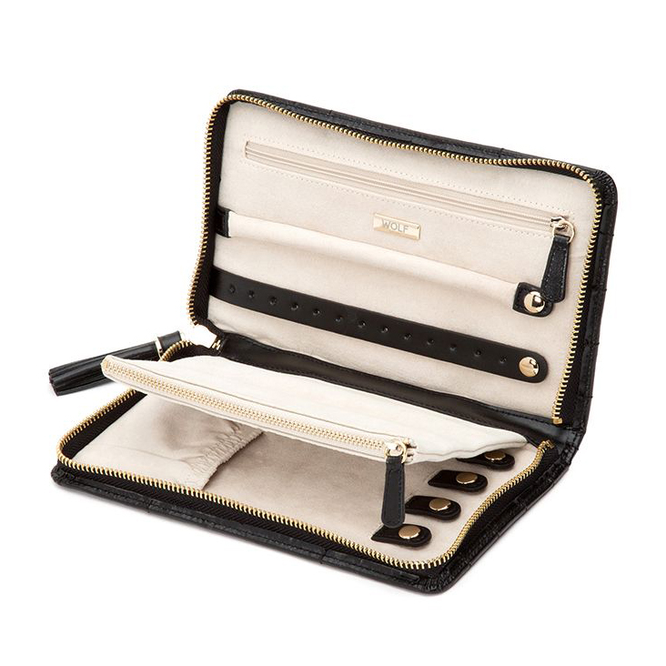 Die Schmuckrollen von WOLF gibt es in einer Reihe von einzigartigen Designs, die weit über das typische aufgerollte Stück Stoff hinausgehen. Einige Schmuckrollenmodelle sind mit verchromten oder vergoldeten Verschlüssen, Krawattenverschlüssen, Reißverschlussfächern, Ohrringhaltern oder anderen Details ausgestattet.