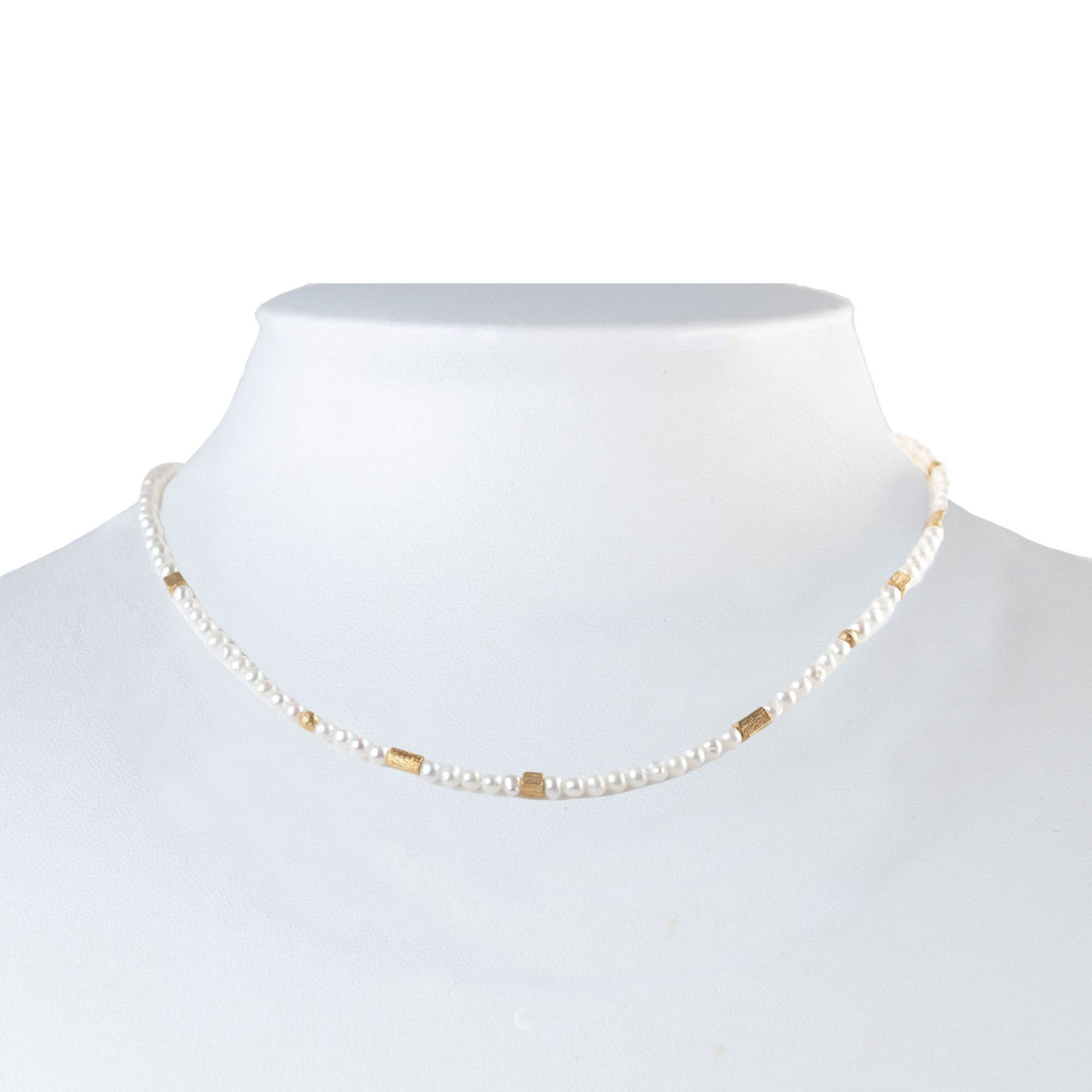Entdecken Sie die subtile Eleganz des Rohm Süßwasser-Zuchtperlen-Colliers. Dieses exquisite Schmuckstück, gefertigt aus feinsten weißen Süßwasser-Zuchtperlen, vereint traditionelle Eleganz mit modernem Design. Die Perlen in sanfter Kartoffel-Form sind durch satinierte Elemente aus 925er vergoldetem Silber harmonisch verbunden, die dem Collier einen Hauch von luxuriösem Glanz verleihen.