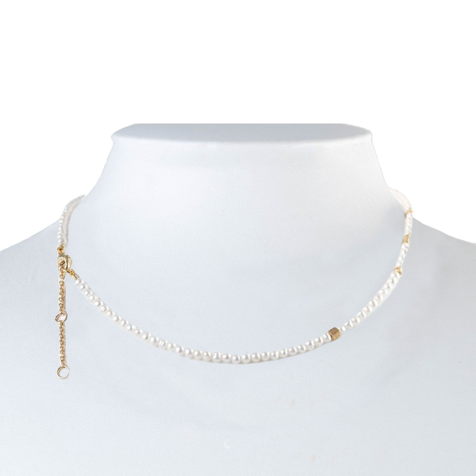 Mit einer Länge von 42 cm plus einer zusätzlichen Verlängerung von 5 cm, ermöglicht dieses Collier eine individuelle Anpassung an verschiedene Halsgrößen. Die filigranen Perlen messen zwischen 3 und 3,5 mm und bieten durch ihre dezente Größe einen eleganten, aber unaufdringlichen Akzent zu jedem Outfit. Das einreihige Design unterstreicht dabei die zarte Schönheit der Perlen und macht dieses Schmuckstück zu einem perfekten Begleiter für jeden Tag.