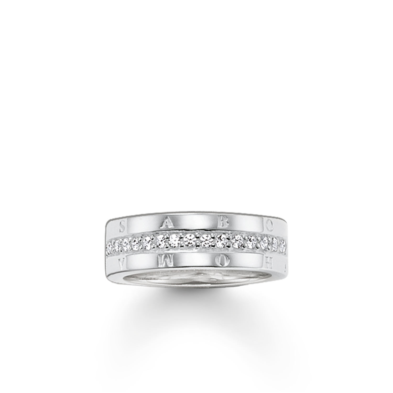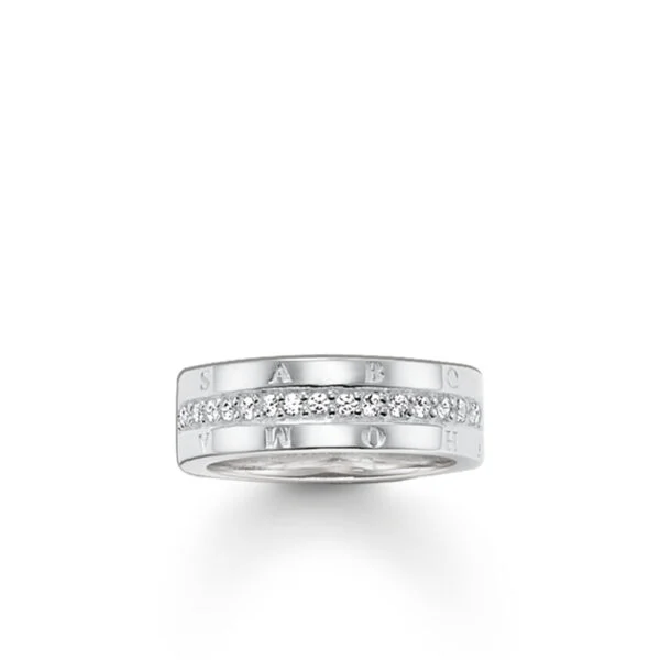 Ring aus 925er Sterlingsilber mit rundum laufenden weißen Zirkonia. Ebenfalls rundum läuft das Branding „THOMAS SABO“. (Breite: 0,7 cm)