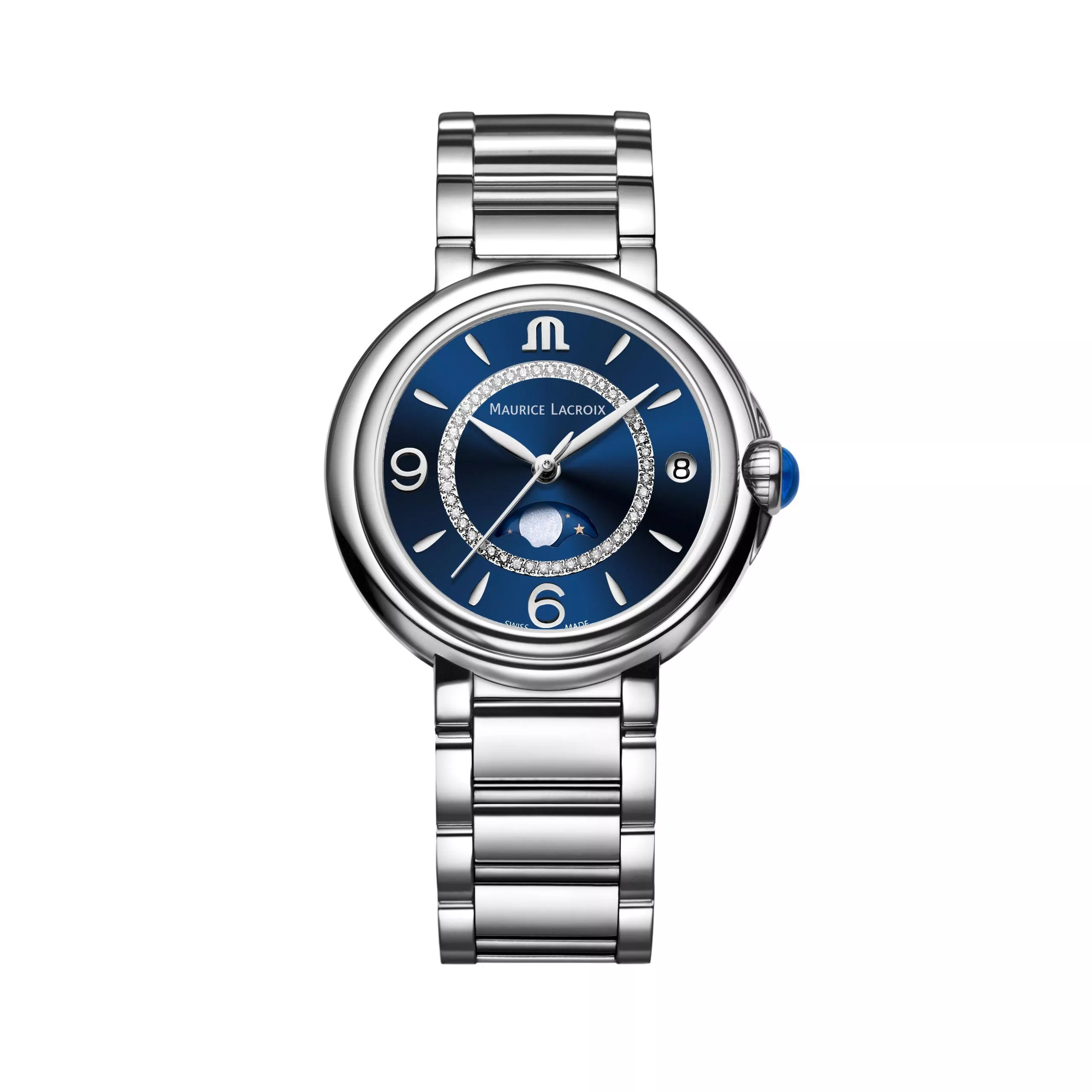 Wie ein Blick in den Nachthimmel fühlt es sich an, auf diese neue FIABA Moonphase 32mm zu sehen. Die Uhr mit Gehäuse aus Edelstahl fasst ein tiefblaues Zifferblatt mit Sonnenschliff, das mit 46 Diamanten besetzt ist. Auch die Mondphasen-Komplikation und der für eine FIABA typische blaue Spinell auf der Krone legen die Assoziation mit einem Nachthimmel nahe. Die Datumsfunktion bei 3 Uhr rundet die Kombination von ästhetischem Design und bewährter Funktionalität ab.
