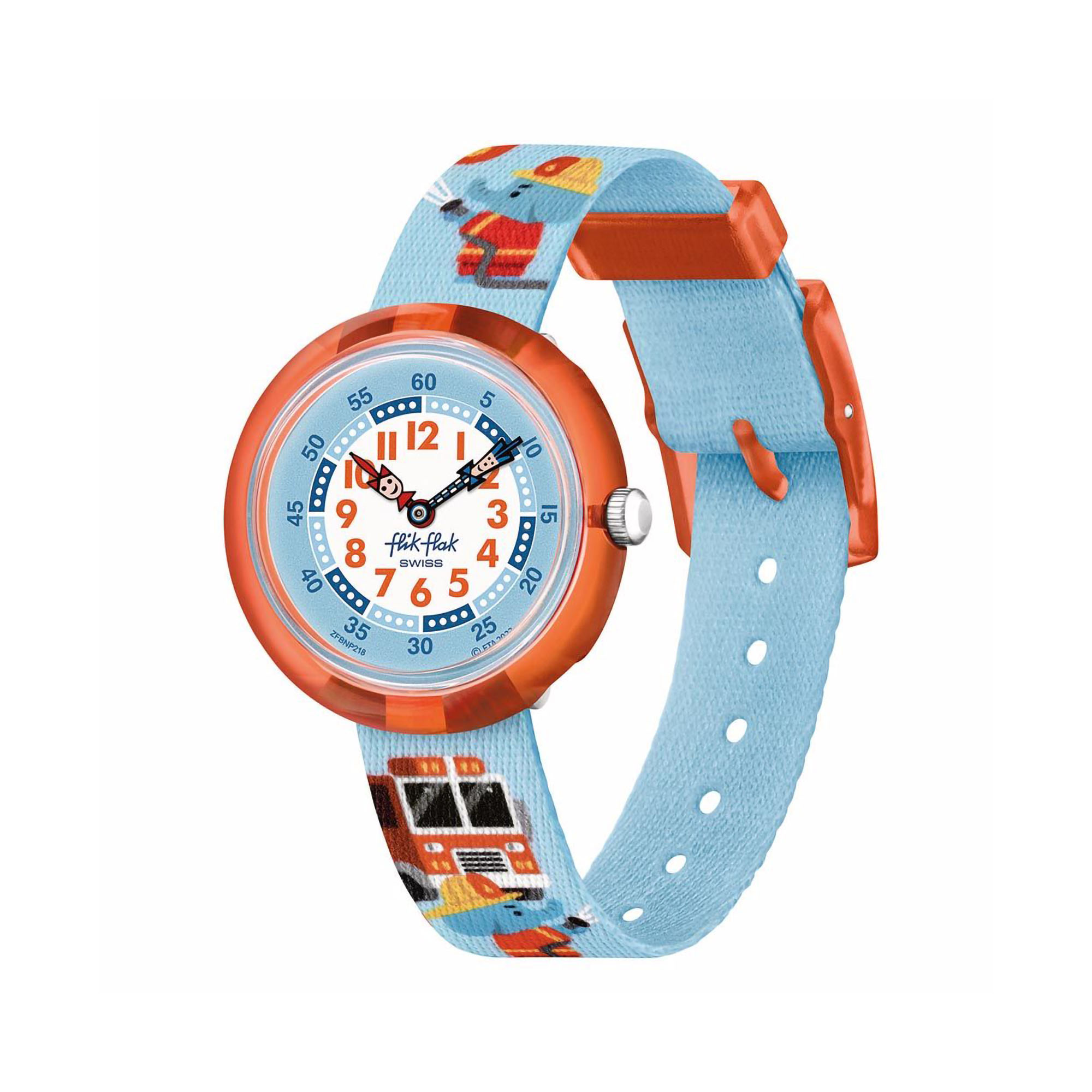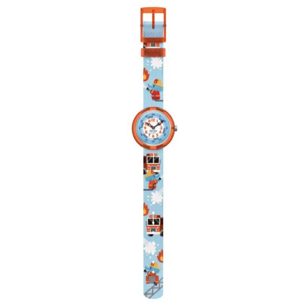 Schon Feuer und Flamme? Unsere lehrreiche hellblaue Kinderuhr mit Feuerwehrautos und einem Feuerwehr-Elefanten sorgt garantiert für Freude.