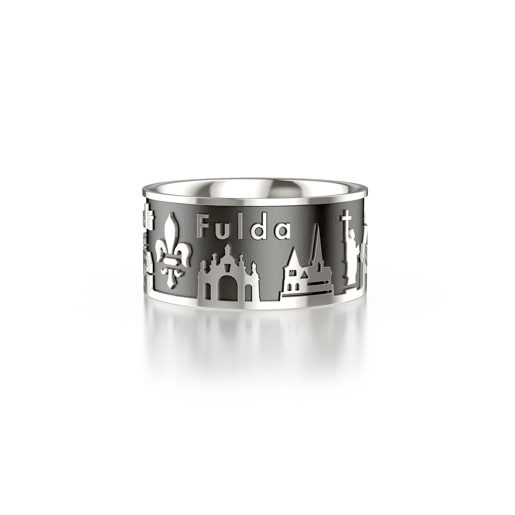 Das neue Design ist da! Auf dem Ring aus Sterling Silber sehen Sie das Relief des Fuldaer Doms St. Salvador, der Statue des Hl. Bonifatius, der Michaelskirche, eine Fuldaer Lilie, das Paulustor, das Kloster Frauenberg, das Stadtschloss mit Orangerie und die Floravase.