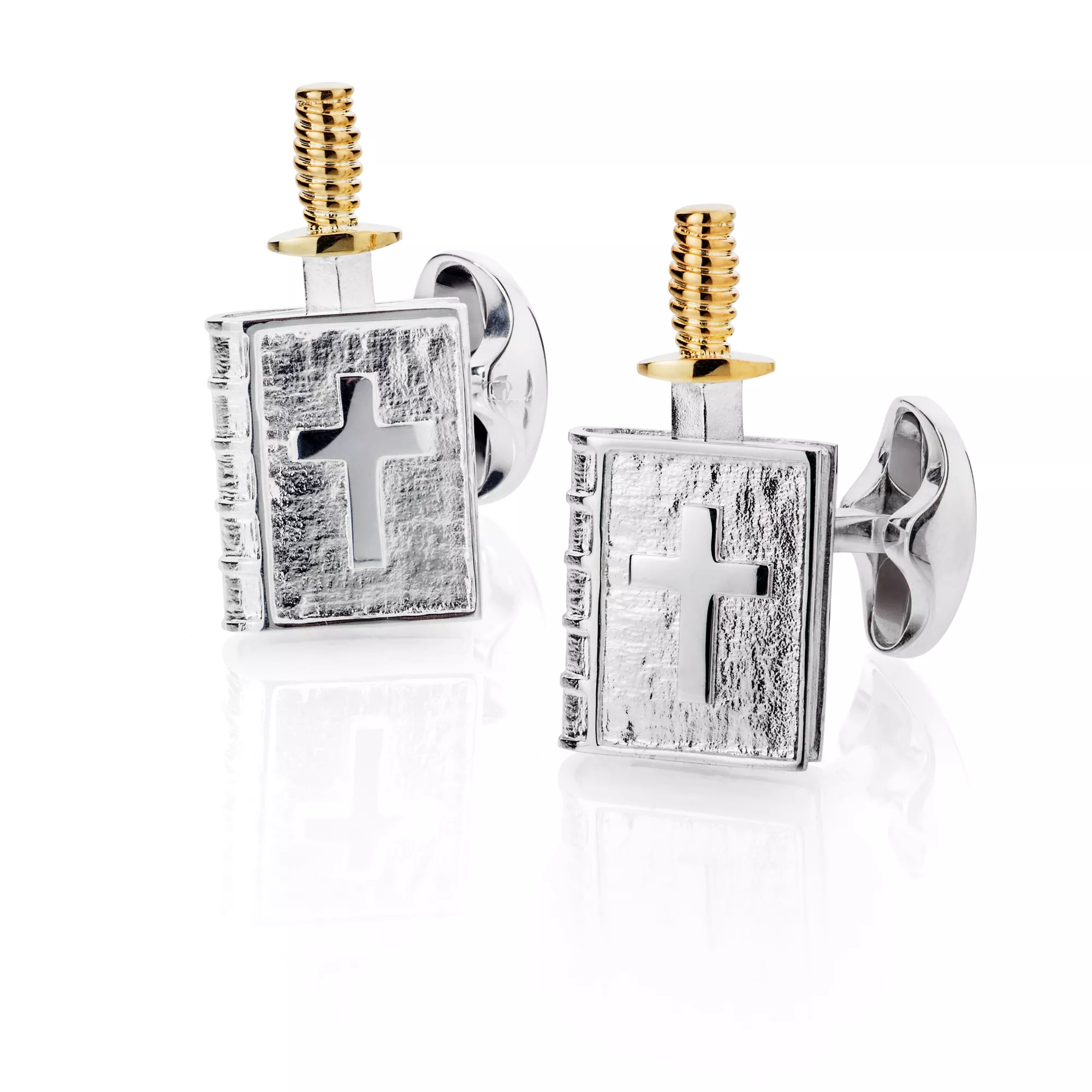 Der Bonifatius-Manschettenknopf ist hochwertig in Silber gefertigt mit vergoldeten Elementen und zeigt er in einem einzigen aussagekräftigen Motiv die ganze Geschichte des Missionars der Deutschen. Der Legende nach begegnete Bonifatius drohender Gewalt mit den Worten der heiligen Schrift. In Skulpturen und Gemälden wird er oft mit zum Schutz vor das Gesicht gehobener Bibel dargestellt, in der Bibel steckt Schwert oder Dolch des Gegners. Dieses Motiv inspirierte Christian Adolph, Inhaber von Juwelier Bott, zu dem Manschettenknopf aus detailreich gearbeiteter Bibel mit dem beweglichen Dolch. Das traditionsreiche Haus Deakin & Francis in England fertigte in exklusiver Handarbeit mehrere Entwürfe bis zum finalen Glanzstück. Der Träger dieser edlen Knöpfe am Hemdärmel pflegt nicht nur klassische Eleganz und Heimatverbundenheit, sondern kann sich auch mal seinem Spieltrieb hingeben – das muss Er ausprobieren!