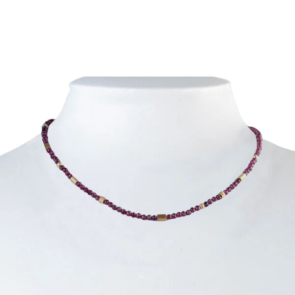 Jeder Stein misst 3 mm im Durchmesser und ist in einer eleganten, einreihigen Anordnung platziert, die die natürliche Schönheit und Farbtiefe des Granats betont. Dieses Collier kombiniert zeitlose Eleganz mit modernem Design und ist ein Must-have für jede Schmucksammlung, perfekt geeignet, um jedem Outfit einen Hauch von Luxus und Raffinesse zu verleihen.
