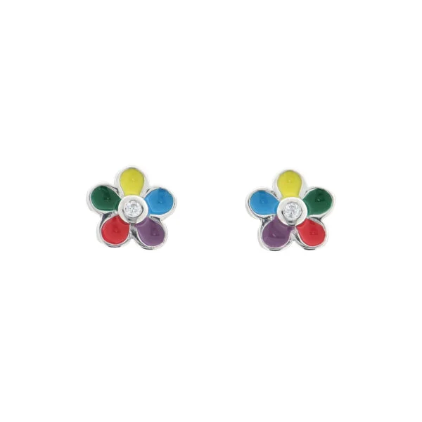 Dieser niedliche Kinder-Ohrstecker aus 925 Sterling Silber zeigt eine bunte Blume, die in hochwertiger Juwelierqualität gearbeitet ist. Die farbenfrohen Blütenblätter sind in verschiedenen Farben lackiert und in der Mitte funkelt ein kleiner, weißer Zirkonia.