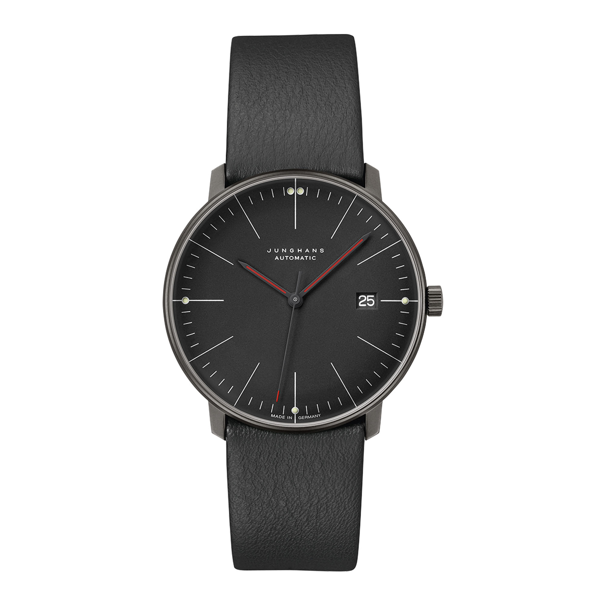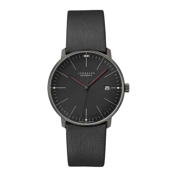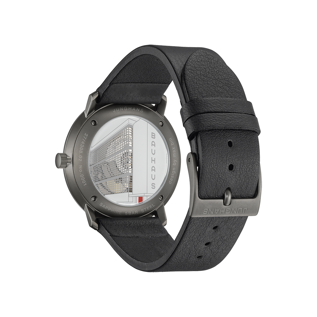 Entdecken Sie die Junghans Max Bill Automatic Bauhaus Uhr, Modell 27/4308.02. Diese Uhr Präzision vereint minimalistisches Design mit Funktionalität und feiert die Prinzipien der Bauhaus-Schule. Ihr schlichtes Zifferblatt in Schwarz mit roten Akzenten steht im Kontrast zum robusten Edelstahlgehäuse mit PVD-Beschichtung und dem Lederarmband, das Alltagstauglichkeit gewährleistet. Durch den transparenten Gehäuseboden kann das Automatikwerk J800.1 mit einer Gangreserve von 38 Stunden betrachtet werden. Die Uhr ist bis zu 5 ATM wasserdicht und mit einem kratzfesten Saphirglas ausgestattet, ideal für den täglichen Gebrauch und