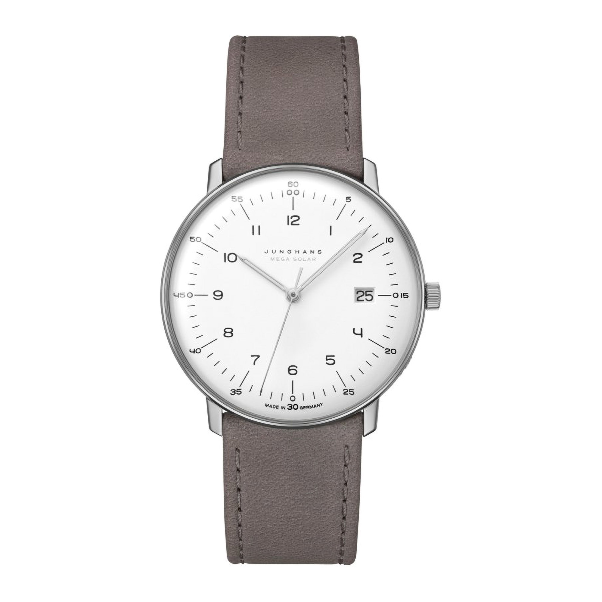 max bill MEGA Solar – Ihr minimalistisches Design bleibt immer modern, ihre Energie schöpft sie aus der Sonne. Dank des Materials Titan erlebt man die Uhr als verblüffend leicht und besonders hautfreundlich. Weiteren Komfort bieten das hochmoderne Funkwerk, ein ewiger Kalender und die einfache Einstellung der Zeitzonen per Krone oder in wenigen Sekunden mit dem Junghans eigenen Zeitsignal der Junghans MEGA App. Auch das Design der max bill MEGA Solar steht ganz im Zeichen der Nachhaltigkeit: Die Bauhaus-typische minimalistische Formensprache bleibt modern – gestern, heute, morgen und übermorgen.