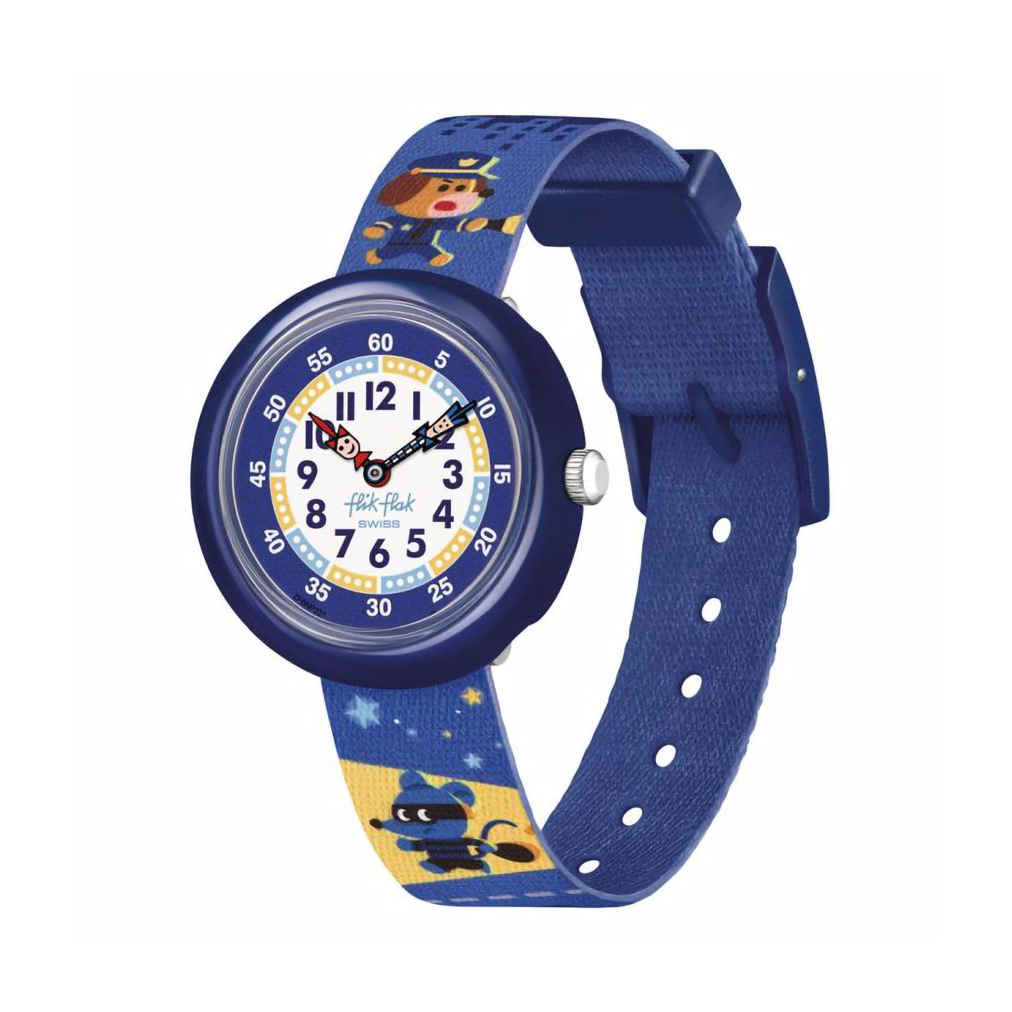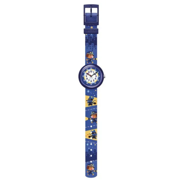 Schnapp sie dir! Unsere blau-gelbe Kinderuhr mit freundlichen Polizisten und frechen Dieben ist ein lehrreiches Geschenk für abenteuerlustige Kids.