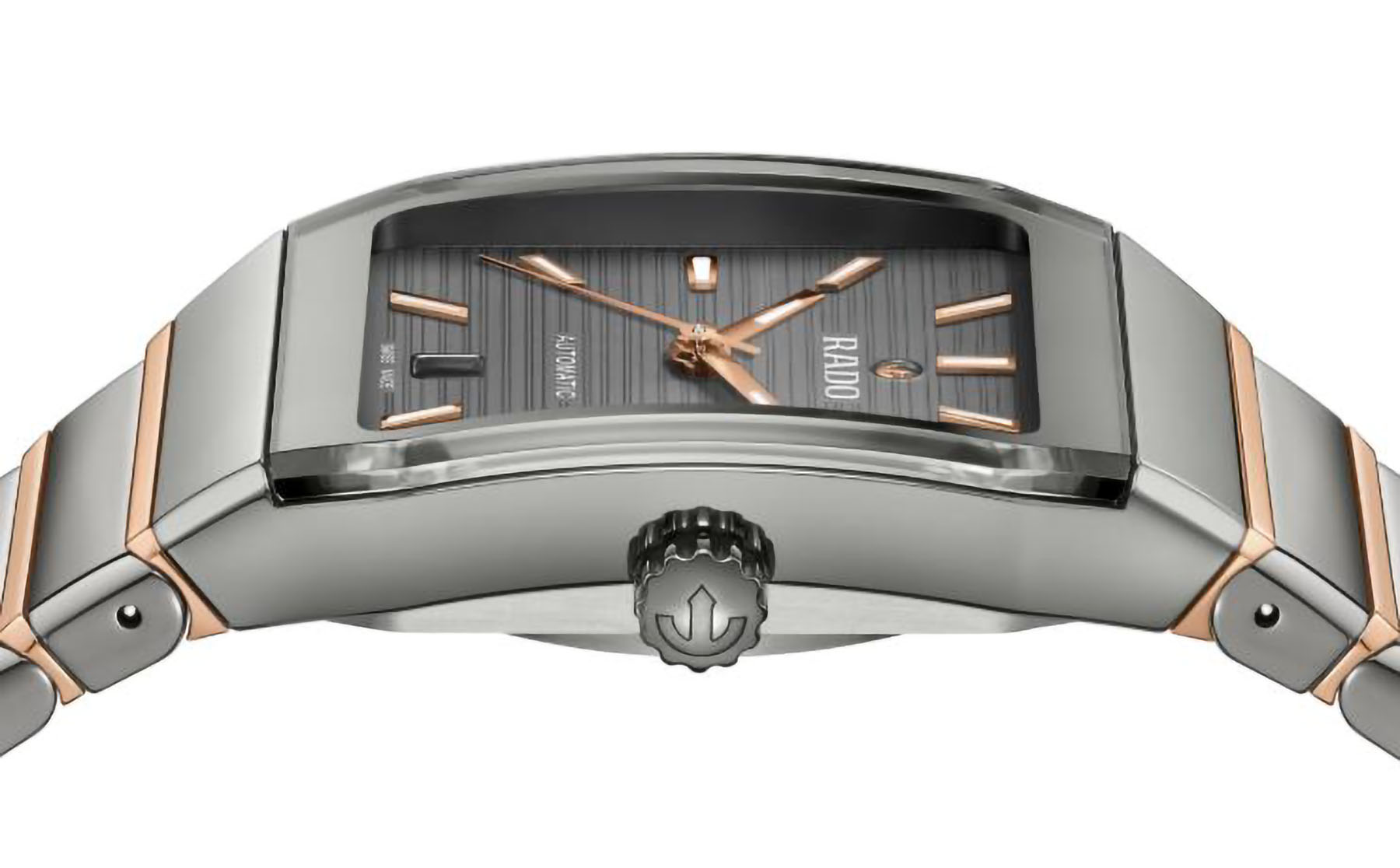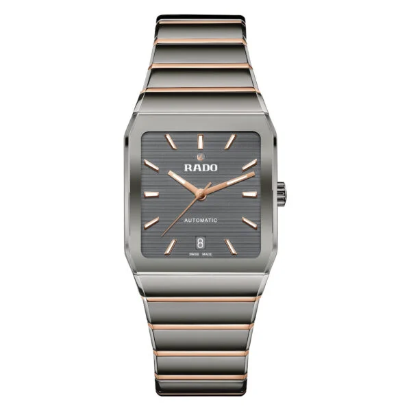 Seit ihrem Debüt im Jahr 1983 ist die Rado Anatom ein Symbol für bahnbrechendes Design und ultimativen Tragekomfort. Ihr charakteristisches Merkmal ist das zylindrische, metallisierte Saphirglas mit facettierten Kanten auf beiden Seiten, das nahtlos in ein Armband aus Plasma Hightech-Keramik übergeht und so eine glatte, durchgehende Form schafft, die Gehäuse und Armband zu einer geschlossenen Einheit verschmelzen lässt. Das aus polierter Plasma Hightech-Keramik und Mittelgliedern aus poliertem roségoldfarbenen PVD-Edelstahl gefertigte Armband wird durch eine Dreifachschliesse aus gebürstetem Edelstahl sorgfältig gesichert. Unter dem markanten Glas liegt ein grau lackiertes Zifferblatt, das ein attraktives Muster aus horizontalen Linien aufweist. Die mit weissem Super-LumiNova® versehenen roségoldfarbenen Zeiger und Indizes bilden einen raffinierten Kontrast, der dem Zifferblatt zusätzlich Tiefe verleiht. Gekrönt wird das Zifferblatt mit dem ikonischen beweglichen Anker bei 12 Uhr, ergänzt durch ein diskretes Datumsfenster bei 6 Uhr. Herzstück der Uhr ist das Automatikwerk Kaliber R766 mit 21 Steinen, das durch den Gehäuseboden aus Saphirglas zu sehen ist. Das in fünf Lagen fein justierte Uhrwerk ist mit einer Nivachron™ Spiralfeder ausgestattet und bietet eine hohe Ganggenauigkeit sowie eine robuste Gangreserve von 72 Stunden. Dies unterstreicht den hohen Stellenwert, den Rado der Perfektion beimisst.