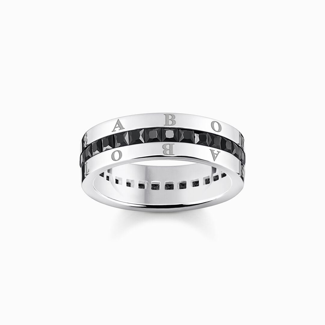 Zeitlose Eleganz: Der Ring für Damen besteht aus leicht geschwärztem 925er Sterlingsilber und ist in stilvollem Design gestaltet. Er ist von Hand mit schwarzen Zirkonia-Steinen im edlen Prinzessschliff besetzt. Die offene Kanalfassung macht das Funkeln der Steine bei Lichteinfall besonders intensiv. Sie sind von THOMAS SABO Gravur eingerahmt.
