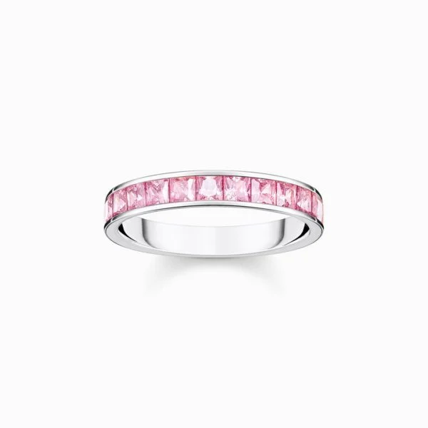 Zeitlose Eleganz: Der Ring für Damen besteht aus hochwertigem 925er Sterlingsilber und ist an der Unterseite mit THOMAS SABO Gravur verziert. Handgesetzte Zirkonia-Steine im quadratischen Prinzessschliff lassen ihn einem glamourösen Pinkton erstrahlen. Die offene Kanalfassung macht das Farbenspiel der Steine bei Lichteinfall besonders intensiv.