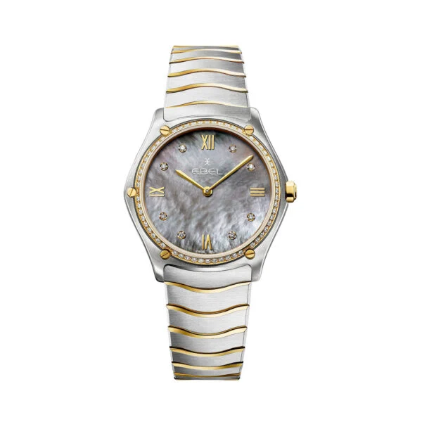Die 1911 in La Chaux-de-Fonds gegründete Uhrenmanufaktur Ebel kombiniert in ihren Uhrenkreationen schweizerische Präzision mit einem herausragenden Gespür für Design und Eleganz. Mit der exklusiven Damenuhr von Ebel setzt du ein eindrucksvolles Statement. Das SPORT CLASSIC-Modell überzeugt durch sein ansprechendes Design, das spielend leicht jedes Outfit aufwertet. Das silberne Gold und Edelstahl-Armband bildet eine harmonische Ergänzung zum klassisch-modernen Stil der Uhr mit Edelstahl-Gehäuse und bietet höchsten Tragekomfort. Durch den Gehäusedurchmesser von 33 mm ist die SPORT CLASSIC vor allem für zarte Handgelenke die richtige Wahl. Das graue Zifferblatt mit Markierungen fügt sich gekonnt in das Gesamtdesign ein. Die 8 funkelnden Diamanten auf dem Zifferblatt perfektionieren die extravagante Optik auf glamouröse Art. Die Lünette aus Gelbgold wird von Brillanten zum Funkeln gebracht und verleiht dem Design eine glamouröse Note. Für den Schutz des Zifferblattes wurde der „König der Uhrengläser“ verwendet: Saphirglas. Dieses synthetische Material ist so gut wie nicht zu zerkratzen und äußerst widerstandsfähig. Saphirglas ist außerdem quasi immun gegen Stöße und Schläge. Im Inneren tickt ein robustes Eta-Quarzwerk, welches zuverlässige Präzision garantiert. Der Zeitmesser ist wasserdicht bis 5 bar und kann deshalb ganz unbesorgt auch beim Duschen getragen werden. Die Faltschließe verspricht nicht nur sicheren Halt, sondern auch gute Verstellbarkeit.