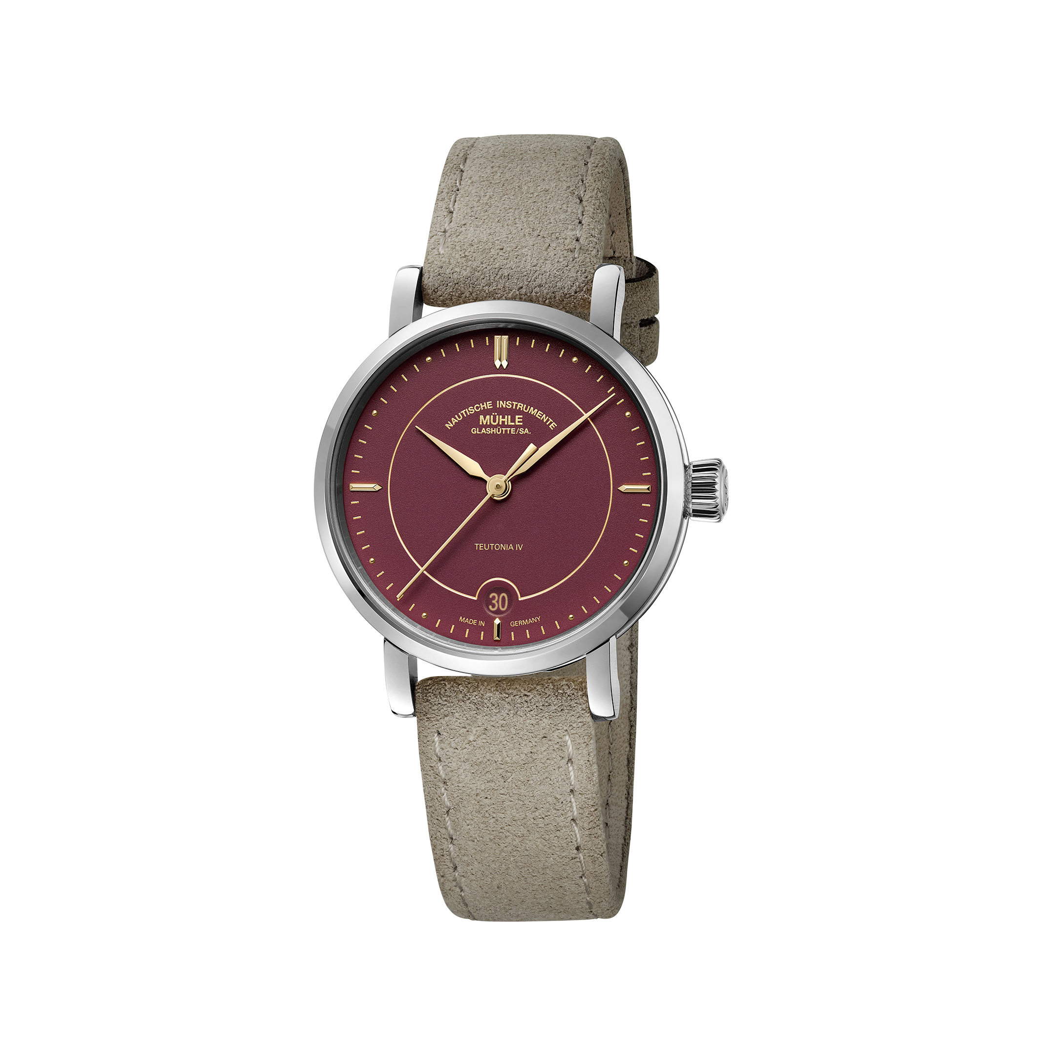Ihrem Namen alle Ehre macht die Teutonia IV Lady. Nicht nur mit ihrem Namenszusatz „Lady“ richtet sie sich eindeutig an das schöne Geschlecht – auch das pastellblaue Zifferblatt sowie die himbeerrote Bicolor-Variante tragen deutlich weibliche Züge. Das Gehäuse der Teutonia IV Lady besitzt einen Durchmesser von 33,5 Millimetern und ist damit ebenfalls prädestiniert für zarte Damenhandgelenke. M1-44-59-200-LB-VII