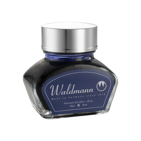 Tintenglas von Waldmann. Geeignet für Waldmann Kolbenfüllhalter. Erhältlich in blau und schwarz.