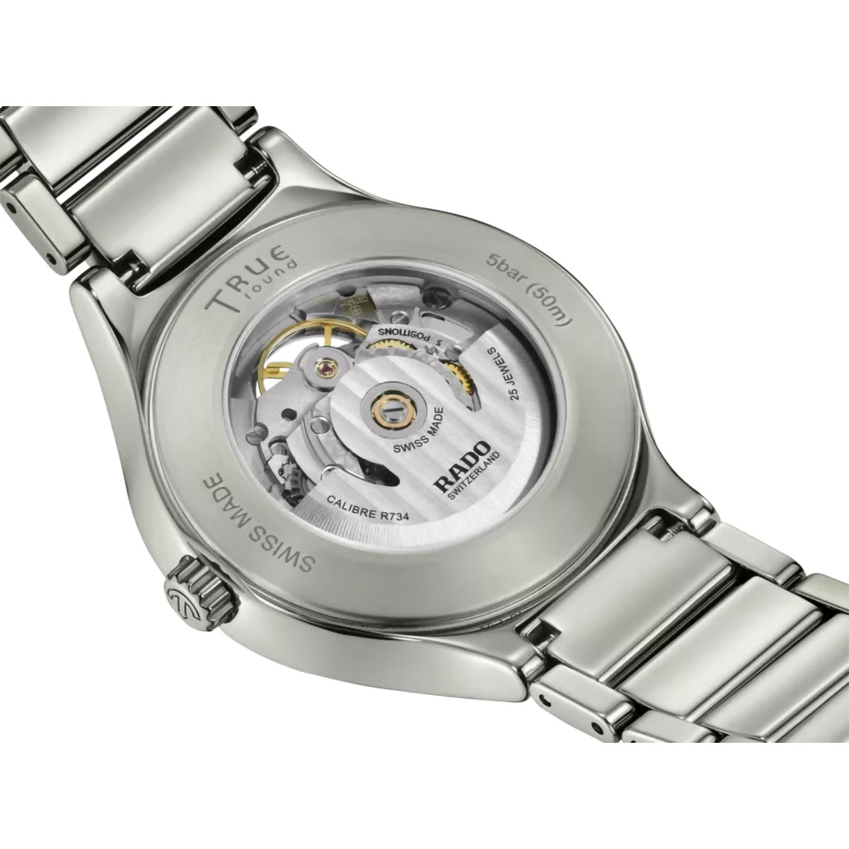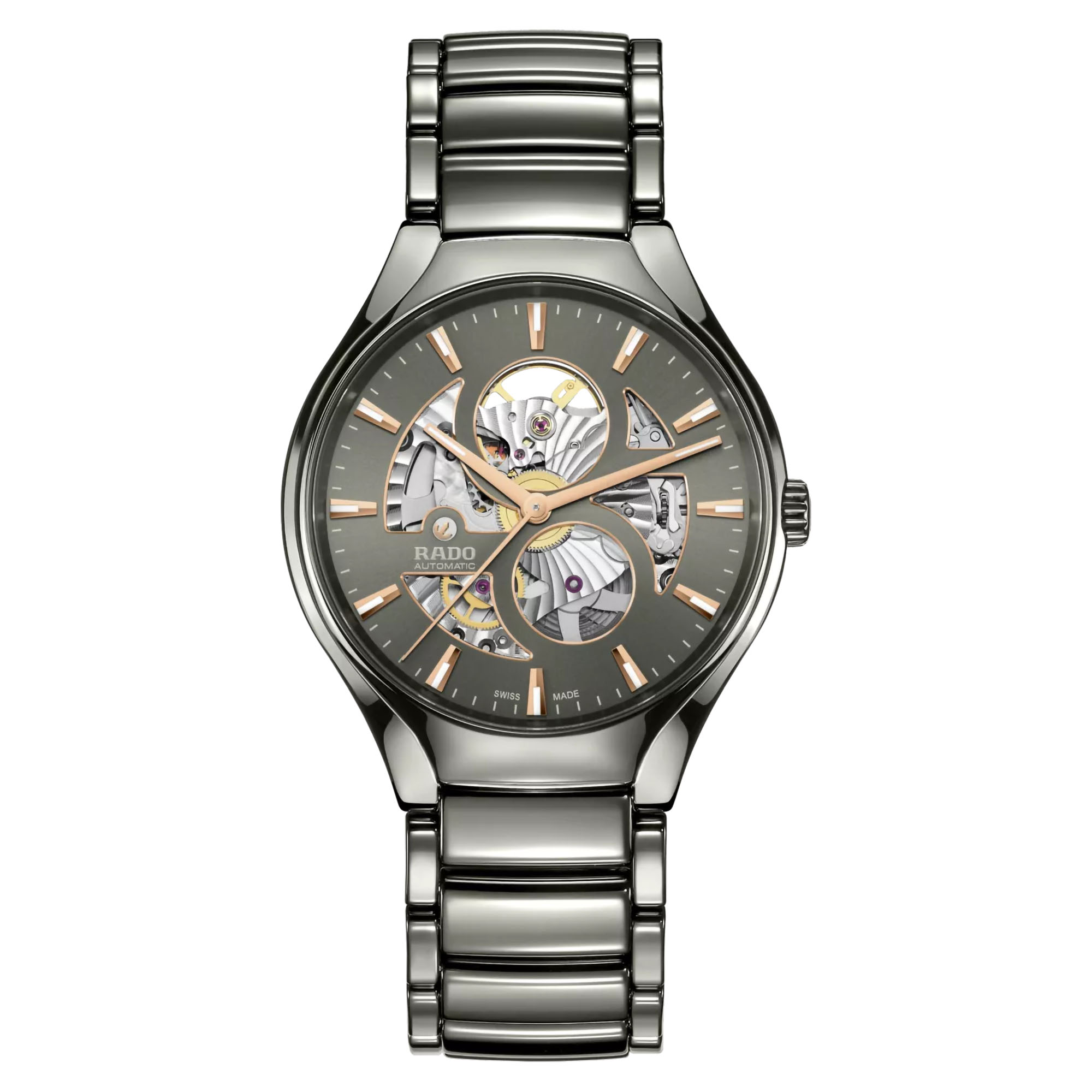 Mit der Rado True Round Open Heart erleben Sie die perfekte Verbindung von exzellentem Design und meisterhafter Materialbeherrschung. Dieser bemerkenswerte Zeitmesser besticht durch sein bezauberndes Open-Heart-Design mit durchbrochenem Zifferblatt, durch das man die komplexe Mechanik des Rado Automatikwerks Kaliber R734 bewundern kann. Das Modell ist zudem mit einer antimagnetischen Nivachron™ Spiralfeder ausgestattet und bietet eine Gangreserve von 80 Stunden. Es verfügt über ein Monobloc-Gehäuse und eine Krone aus polierter Plasma-Hightech-Keramik und einen Gehäuseboden aus Titan mit eingelassenem Saphirglas, das einen atemberaubenden Blick auf das Uhrwerk freigibt. Das Modell hat ein graues Zifferblatt mit Sonnenschliff, roségoldfarbenen Facetten und einer grauen Minuteneinteilung. Farblich perfekt auf die graue Farbgebung abgestimmt ist auch das Armband aus polierter Plasma Hightech-Keramik mit einer Dreifach-Faltschliesse aus Titan. Die Uhr ist wasserdicht bis zu einem Druck von 5 bar (50 m). Die Rado True Round Open Heart ist eine jener Uhren, die nicht nur durch und durch zeitgenössisch sind, sondern auch über eine Langlebigkeit und einen Stil verfügen, die sie zu echten Erinnerungsstücken machen.