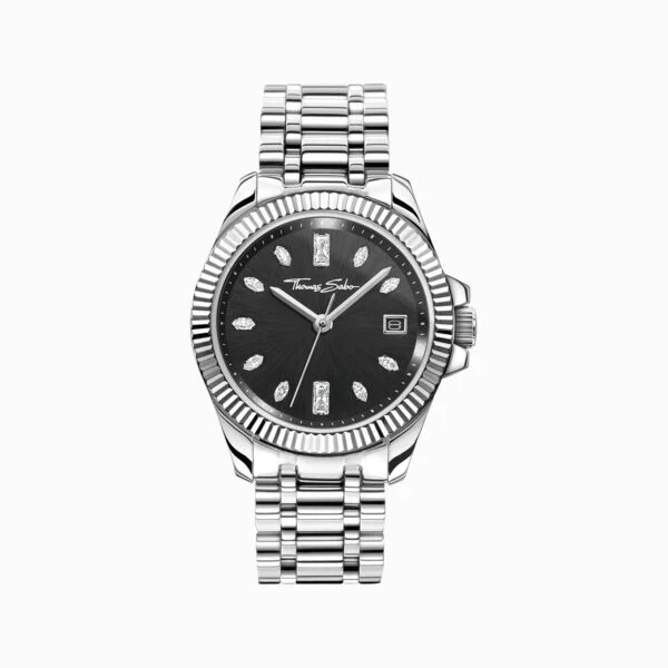 Die Kombination von Eleganz und facettierten Steinen ergibt die Divine Silver Uhr von THOMAS SABO. Das Edelstahlarmband sowie das runde Gehäuse sind klassisch in der Farbe Silber gehalten. Die Lünette in Riffel-Optik sowie das mystische Zifferblatt in Schwarzmit silberfarbenen Zeigern unterstreichen den edlen Charakter der Uhr. Handgesetzte Steine als Indexe im Navette- und Baguetteschliff (bei 12h und 6h) geben der Uhr einen modernen Touch. Darüber hinaus ziert die Krone zum Einstellen der Zeit und des Datums als kleines Detail ein TS-Logo.